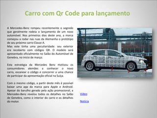 A Mercedes-Benz promoveu o lançamento de seu novo carro Classe A cobrindo o protótipo com códigos QR para que consumidores pudessem escanear e concorrer a participar da apresentação oficial na Suíça ou baixar uma app da marca. A estratégia gerou grande interesse pelo novo modelo.