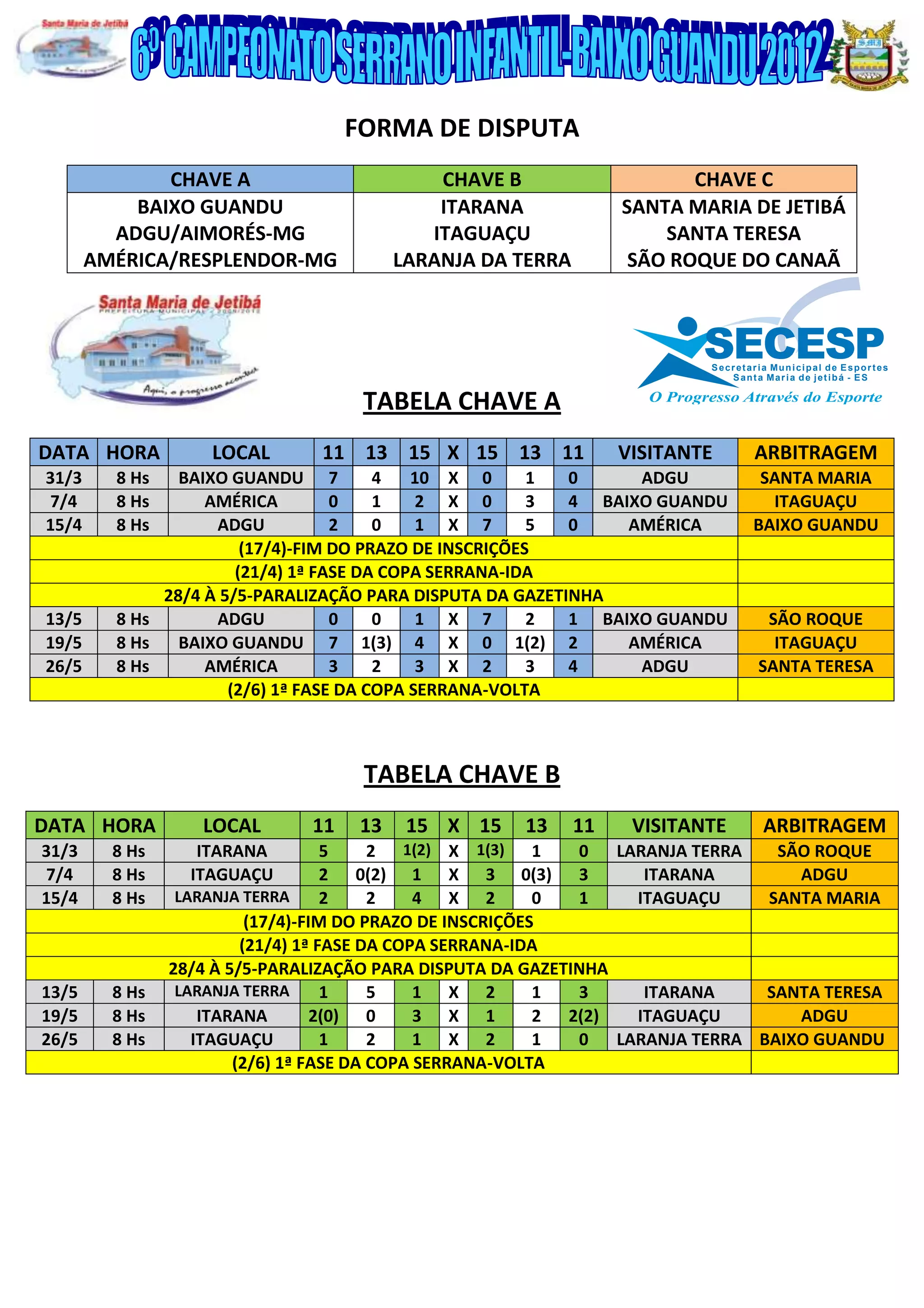 O documento apresenta tabelas de jogos e classificações de três categorias (Sub-11, Sub-13 e Sub-15) de uma competição de futebol entre equipes de municípios da região. Há informações sobre datas, horários, locais dos jogos e resultados. A pontuação geral ao final classifica Baixo Guandu, Itarana e Santa Teresa como os três melhores colocados.