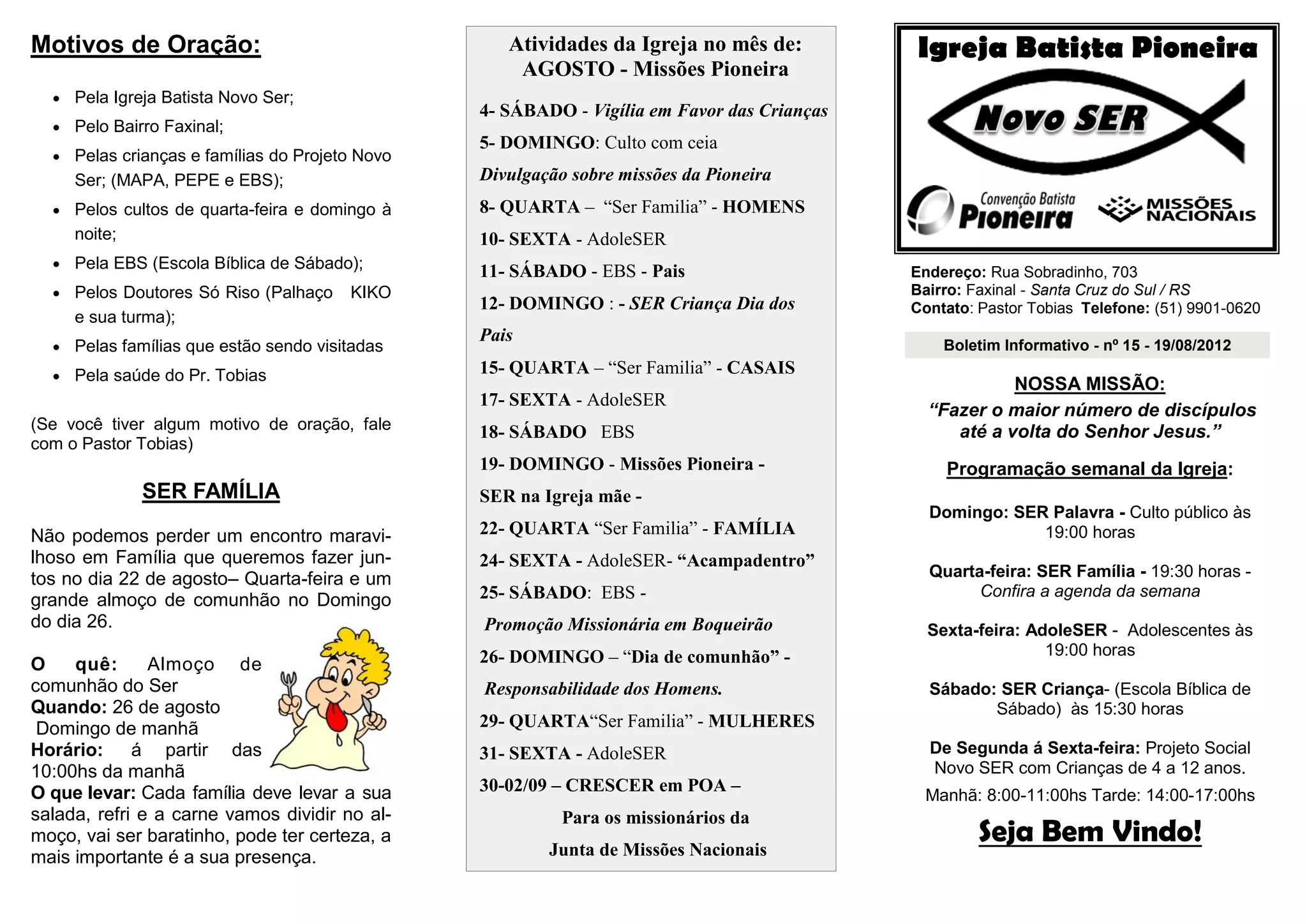 Este documento descreve as atividades e programação da Igreja Batista Pioneira para o mês de agosto, incluindo cultos, projetos sociais, e eventos para famílias, crianças e adolescentes. Ele também discute a missão da igreja de propagar o evangelho, promover a fé cristã e ajudar as pessoas em necessidade.