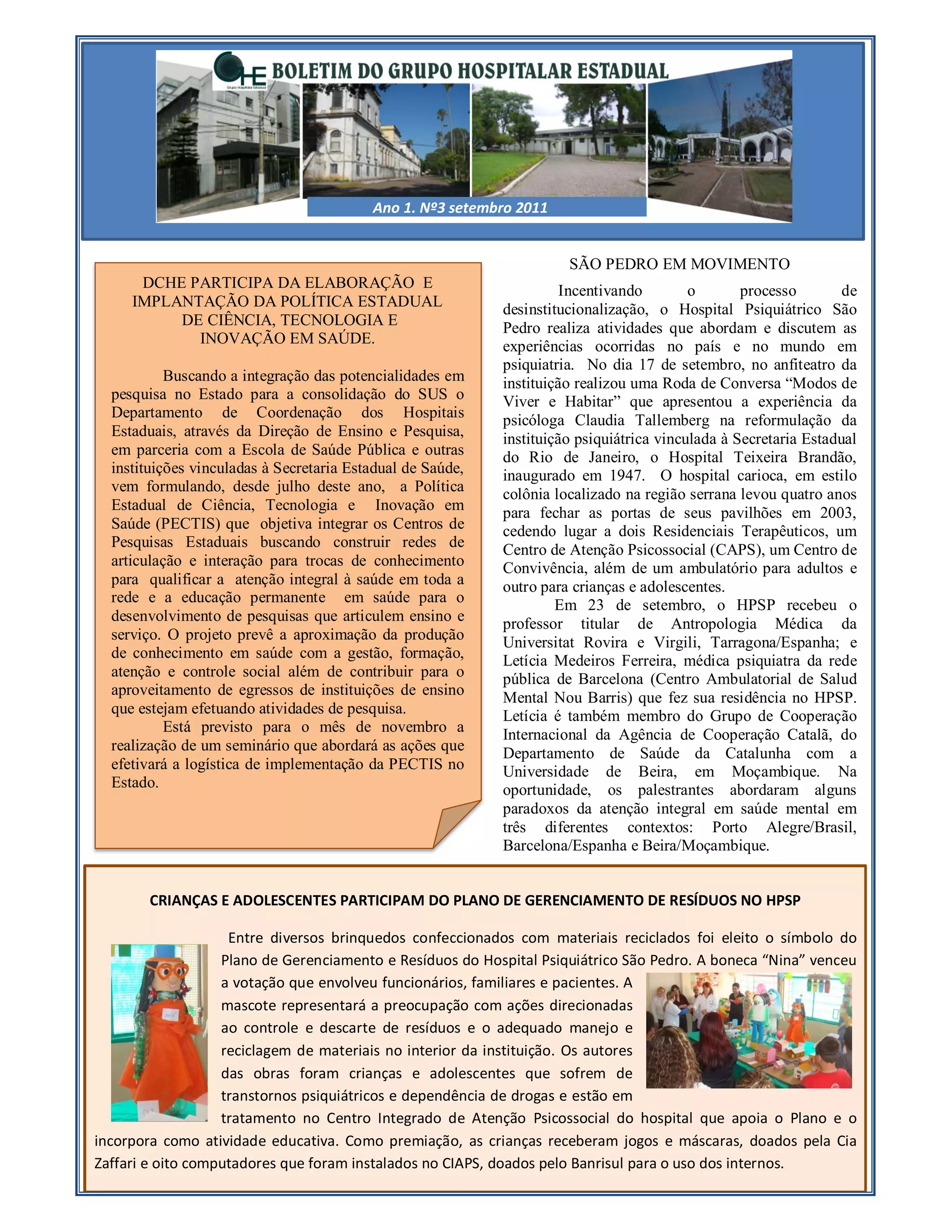 O documento discute as atividades do Hospital Psiquiátrico São Pedro para incentivar a desinstitucionalização, incluindo rodas de conversa sobre experiências em outros hospitais e países. Crianças e adolescentes participaram de atividades para o plano de gerenciamento de resíduos no hospital. Uma nova direção assumiu no Hospital Colônia Itapuã.