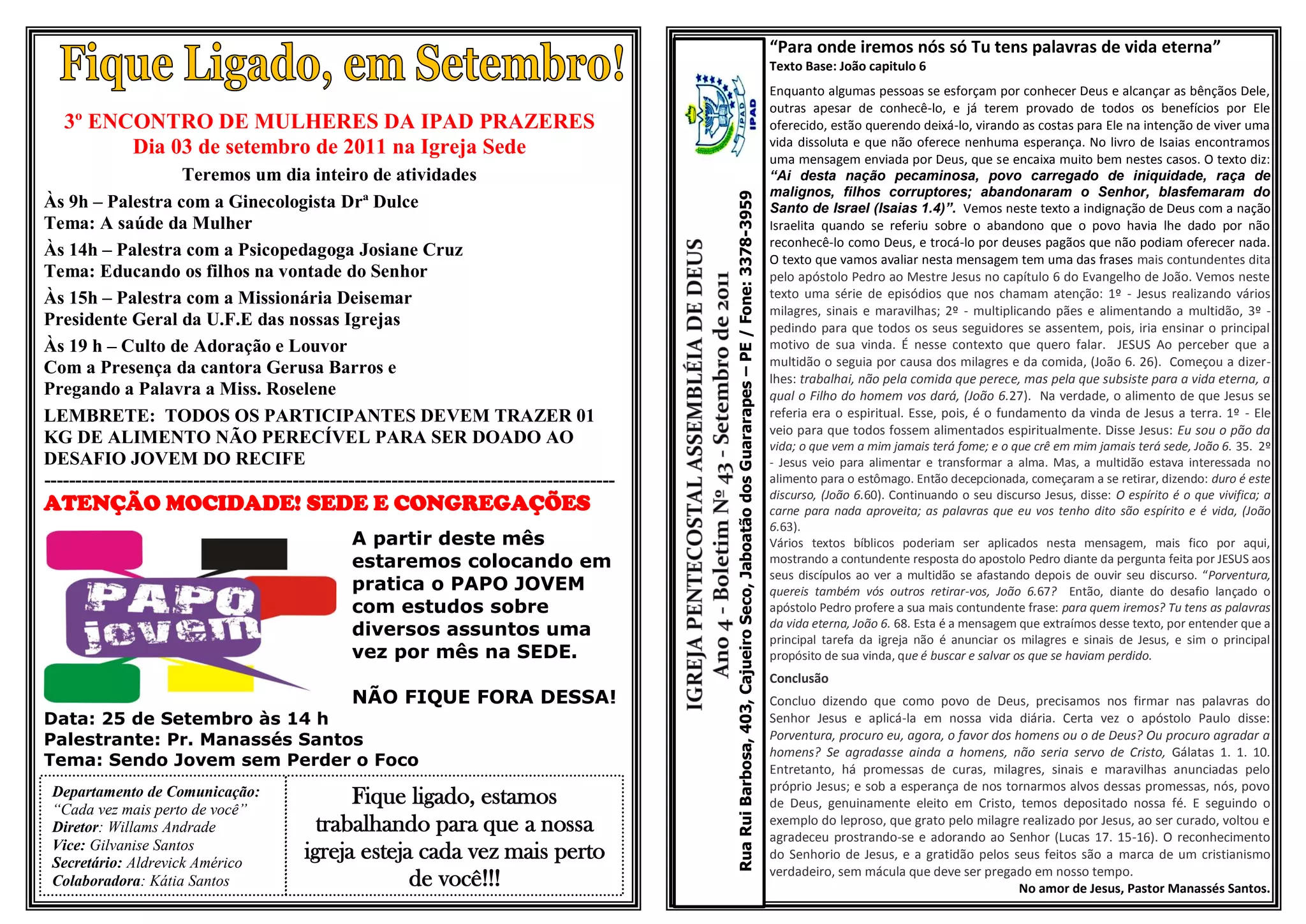 Todas as quartas-feiras, das 19 às 21 h, na Igreja Sede Domingo 15 h Mocidade