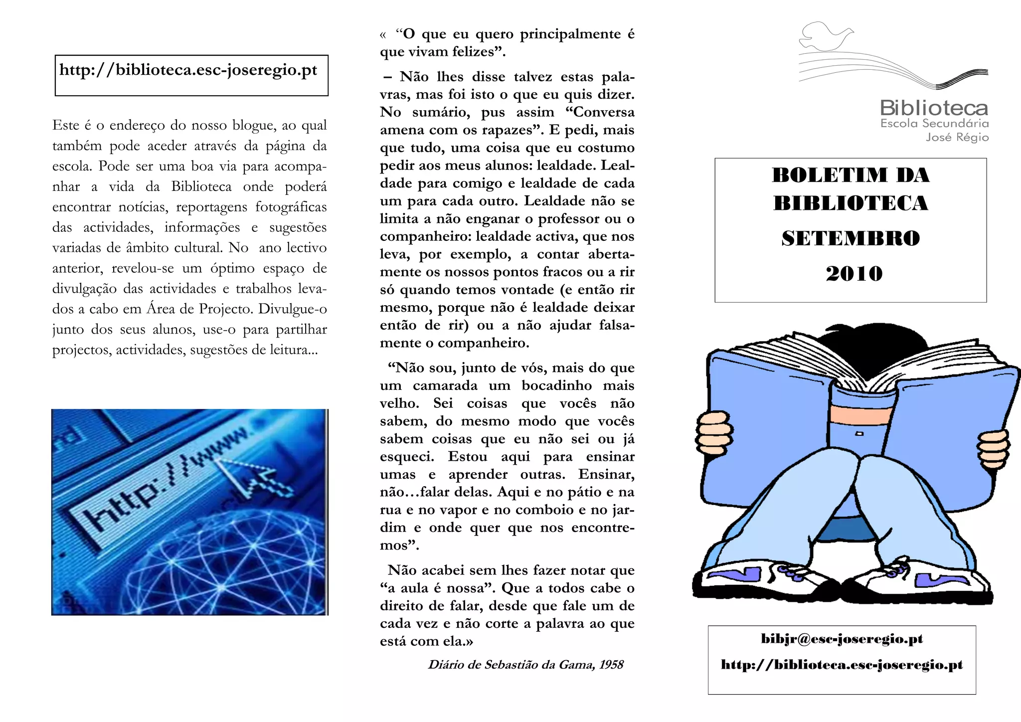 Este documento é um boletim da biblioteca escolar de setembro de 2010. Nele, apresenta-se a biblioteca e algumas regras de funcionamento, como o empréstimo de livros por 15 dias. Também fornece instruções sobre como pesquisar o catálogo online e sobre como os professores devem proceder para levar alunos à biblioteca durante as aulas.