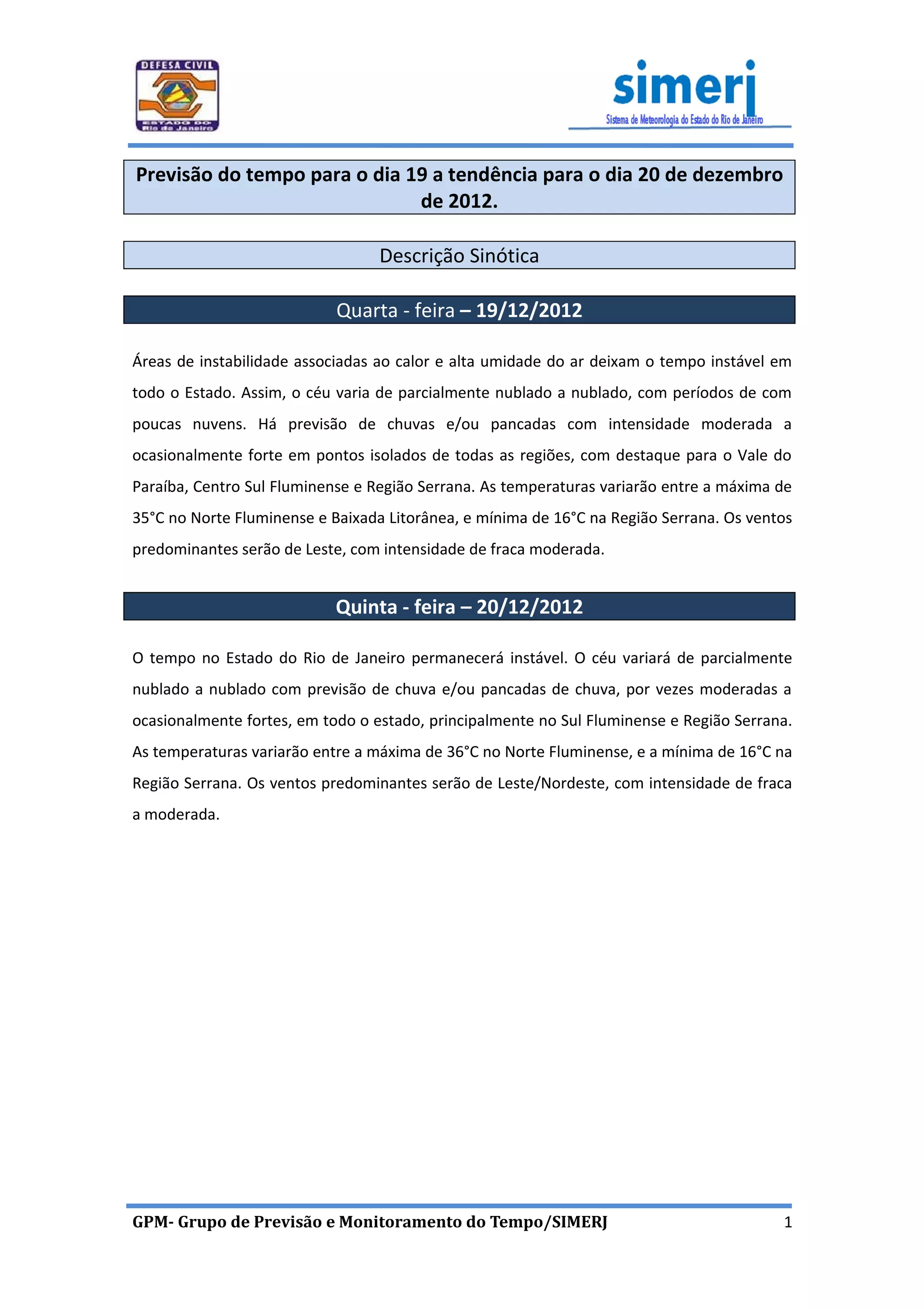 O documento prevê tempo instável no estado do Rio de Janeiro nos dias 19 e 20 de dezembro de 2012, com céu nublado e possibilidade de chuvas moderadas a fortes em diversas regiões, especialmente no Sul Fluminense e Região Serrana. As temperaturas variarão entre 16°C e 36°C.