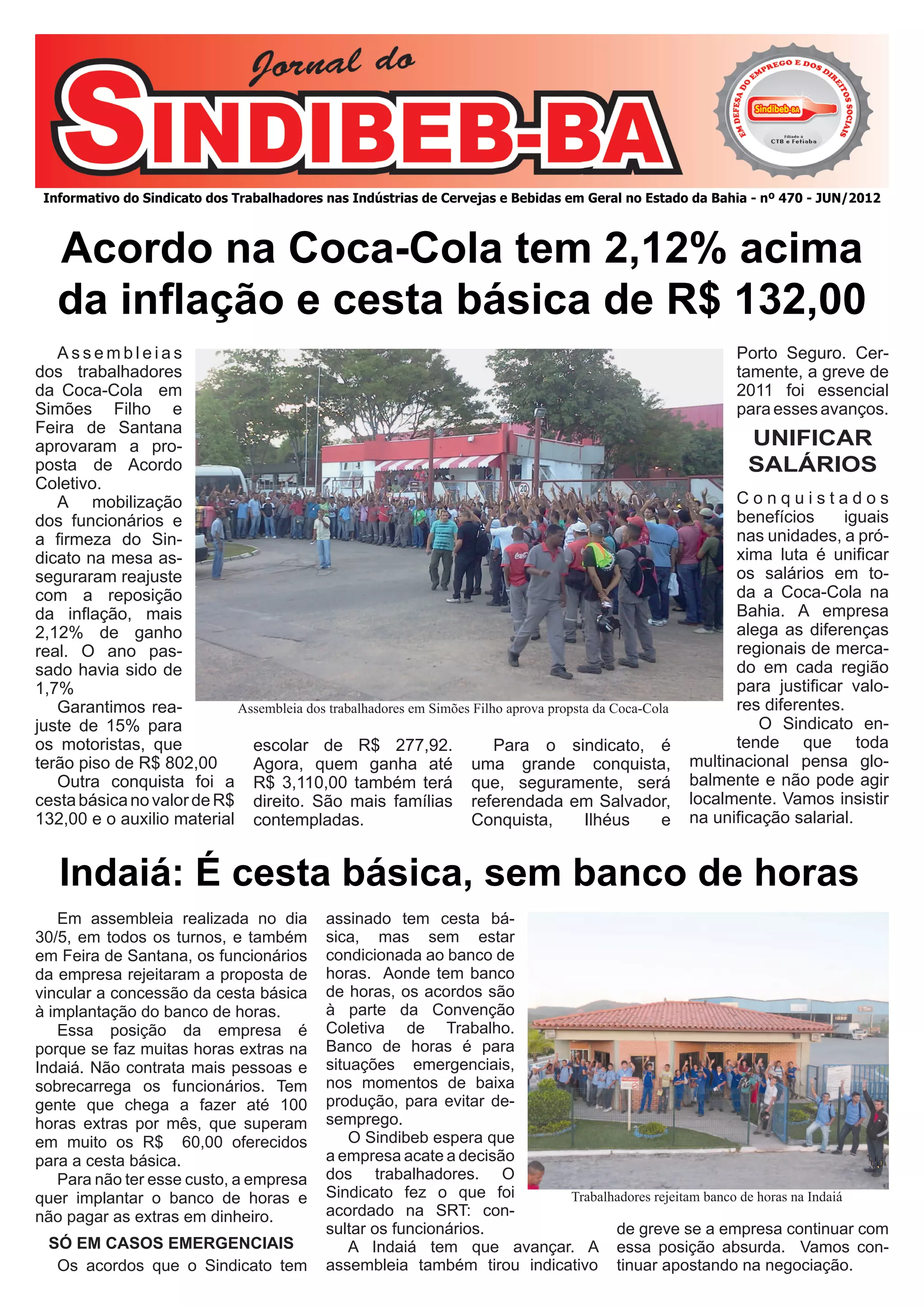 1) Os trabalhadores da Coca-Cola em Simões Filho e Feira de Santana aprovaram um acordo coletivo que garante reajuste salarial de 2,12% acima da inflação e cesta básica de R$ 132.
