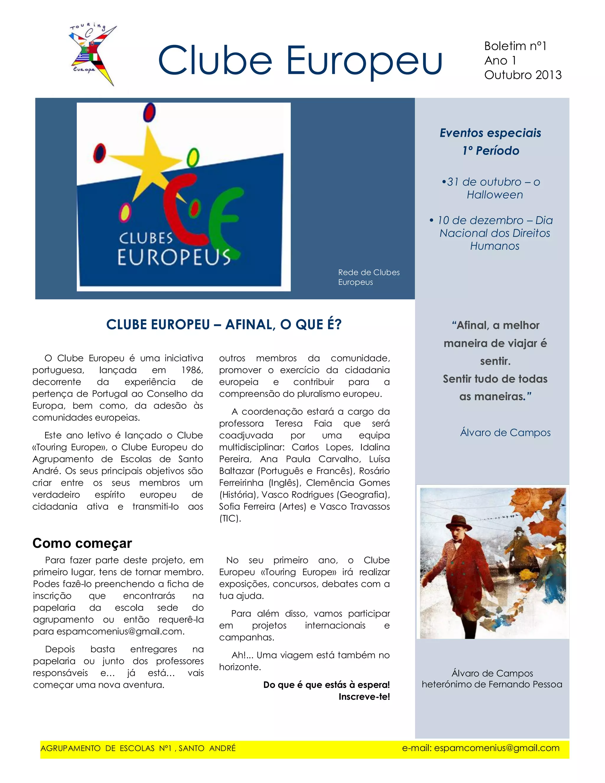 Este documento fornece informações sobre como se juntar ao Clube Europeu "Touring Europe" no Agrupamento de Escolas de Santo André. Os alunos podem se inscrever preenchendo um formulário na secretaria da escola ou enviando um e-mail. Ao se juntar, os membros participarão em exposições, debates e projetos internacionais e terão a oportunidade de viajar.