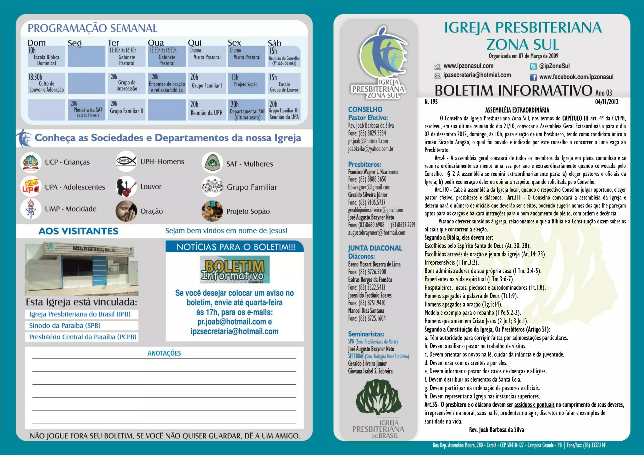 (1) A Igreja Presbiteriana Zona Sul convocou uma Assembleia Geral Extraordinária em 2 de dezembro de 2012 para eleger um novo Presbítero, tendo Ricardo Aragão como único candidato.