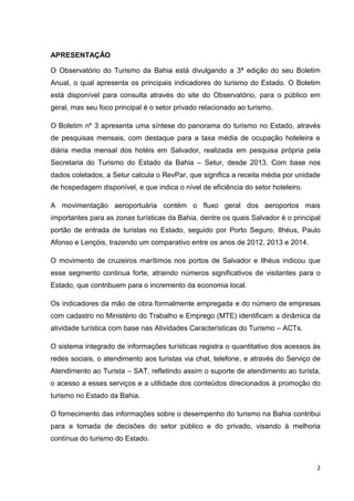 O boletim apresenta os principais indicadores do turismo da Bahia em 2014, mostrando um aumento na taxa de ocupação hoteleira e receita média em Salvador, principalmente durante a Copa do Mundo. Os hotéis na região da Barra tiveram as maiores taxas de ocupação, enquanto os menores hotéis tiveram as diárias mais altas. Os indicadores sugerem um equilíbrio na taxa de ocupação ao longo do ano.