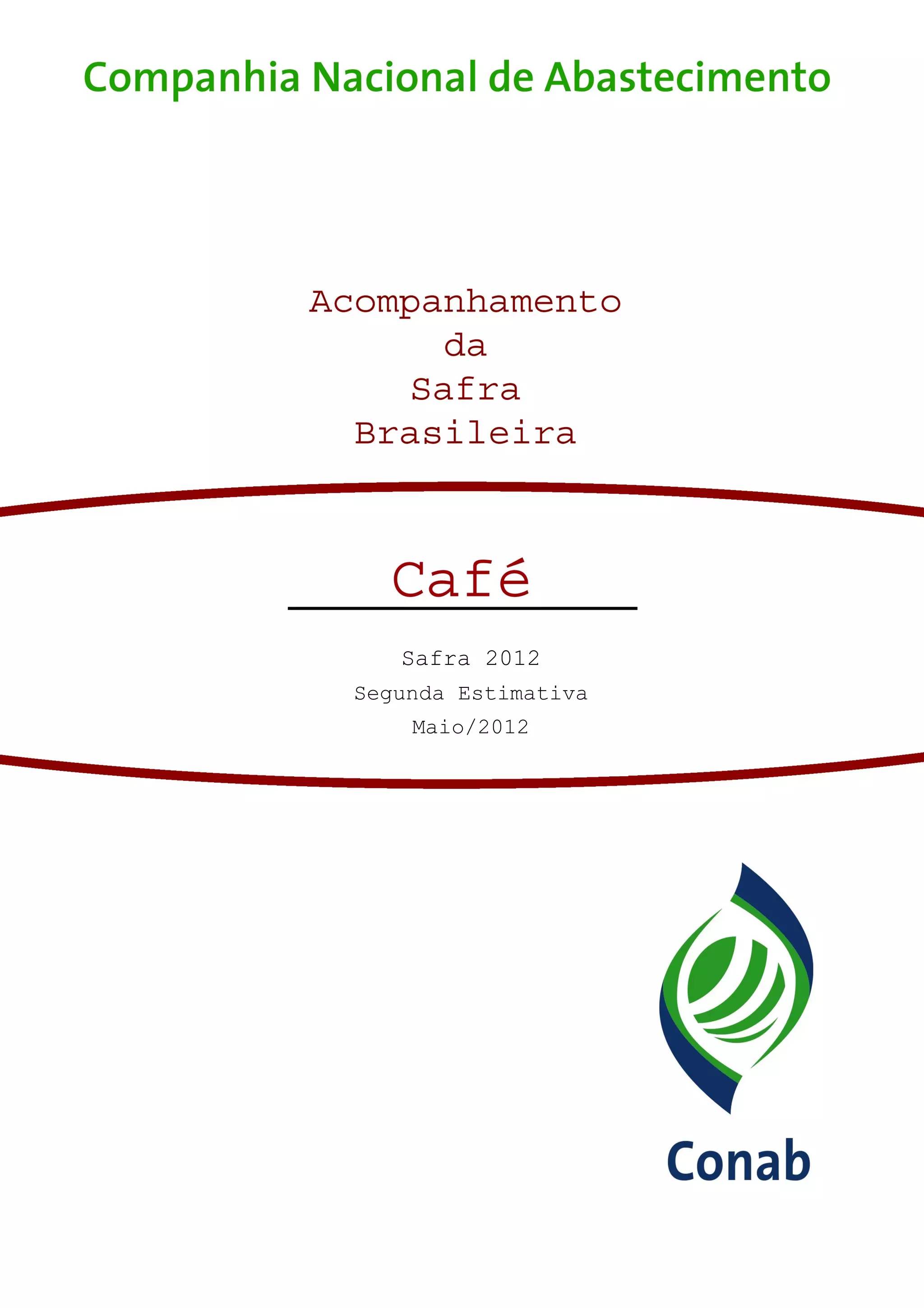 Este documento fornece a segunda estimativa da safra de café de 2012 no Brasil. A produção total estimada é de 50,45 milhões de sacas, um aumento de 16% em relação à safra anterior. Minas Gerais continua sendo o maior produtor, com uma estimativa de 26,64 milhões de sacas, um aumento de quase 21% devido ao ano de alta bienalidade e melhorias nos tratos culturais. O documento também fornece detalhes sobre as condições climáticas e das lavouras nos principais estados produtores