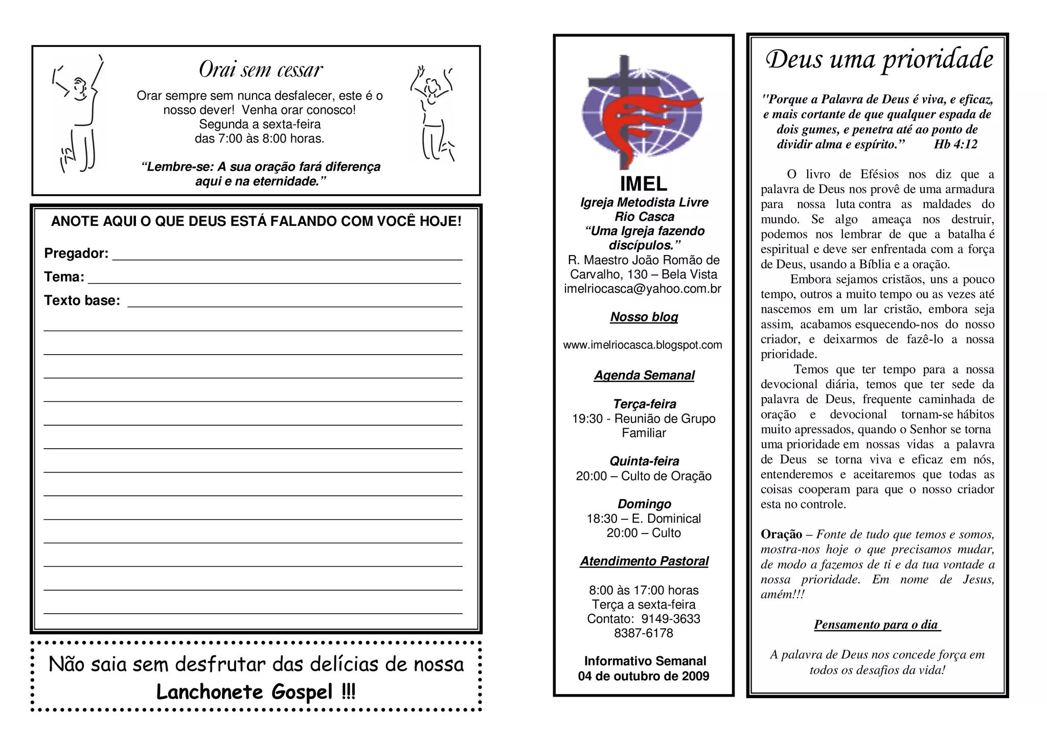 Orai sem cessar Deus uma prioridade Orar sempre sem nunca desfalecer, este é o ''Porque a Palavra de Deus é viva, e eficaz, nosso dever! Venha orar conosco! e mais cortante de que qualquer espada de Segunda a sexta-feira dois gumes, e penetra até ao ponto de das 7:00 às 8:00 horas. dividir alma e espírito.” Hb 4:12 “Lembre-se: A sua oração fará diferença O livro de Efésios nos diz que a aqui e na eternidade.” IMEL palavra de Deus nos provê de uma armadura Igreja Metodista Livre para nossa luta contra as maldades do ANOTE AQUI O QUE DEUS ESTÁ FALANDO COM VOCÊ HOJE! Rio Casca mundo. Se algo ameaça nos destruir, “Uma Igreja fazendo podemos nos lembrar de que a batalha é discípulos.” espiritual e deve ser enfrentada com a força Pregador: ______________________________________________ R. Maestro João Romão de de Deus, usando a Bíblia e a oração. Tema: _________________________________________________ Carvalho, 130 – Bela Vista Embora sejamos cristãos, uns a pouco imelriocasca@yahoo.com.br tempo, outros a muito tempo ou as vezes até Texto base: ____________________________________________ nascemos em um lar cristão, embora seja Nosso blog _______________________________________________________ assim, acabamos esquecendo-nos do nosso www.imelriocasca.blogspot.com criador, e deixarmos de fazê-lo a nossa _______________________________________________________ prioridade. _______________________________________________________ Agenda Semanal Temos que ter tempo para a nossa devocional diária, temos que ter sede da _______________________________________________________ palavra de Deus, frequente caminhada de Terça-feira _______________________________________________________ 19:30 - Reunião de Grupo oração e devocional tornam-se hábitos Familiar muito apressados, quando o Senhor se torna _______________________________________________________ uma prioridade em nossas vidas a palavra Quinta-feira de Deus se torna viva e eficaz em nós, _______________________________________________________ 20:00 – Culto de Oração entenderemos e aceitaremos que todas as _______________________________________________________ coisas cooperam para que o nosso criador Domingo esta no controle. _______________________________________________________ 18:30 – E. Dominical _______________________________________________________ 20:00 – Culto Oração – Fonte de tudo que temos e somos, mostra-nos hoje o que precisamos mudar, _______________________________________________________ Atendimento Pastoral de modo a fazemos de ti e da tua vontade a _______________________________________________________ nossa prioridade. Em nome de Jesus, 8:00 às 17:00 horas amém!!! _______________________________________________________ Terça a sexta-feira Contato: 9149-3633 Pensamento para o dia 8387-6178 A palavra de Deus nos concede força em Não saia sem desfrutar das delícias de nossa Informativo Semanal 04 de outubro de 2009 todos os desafios da vida! Lanchonete Gospel !!!