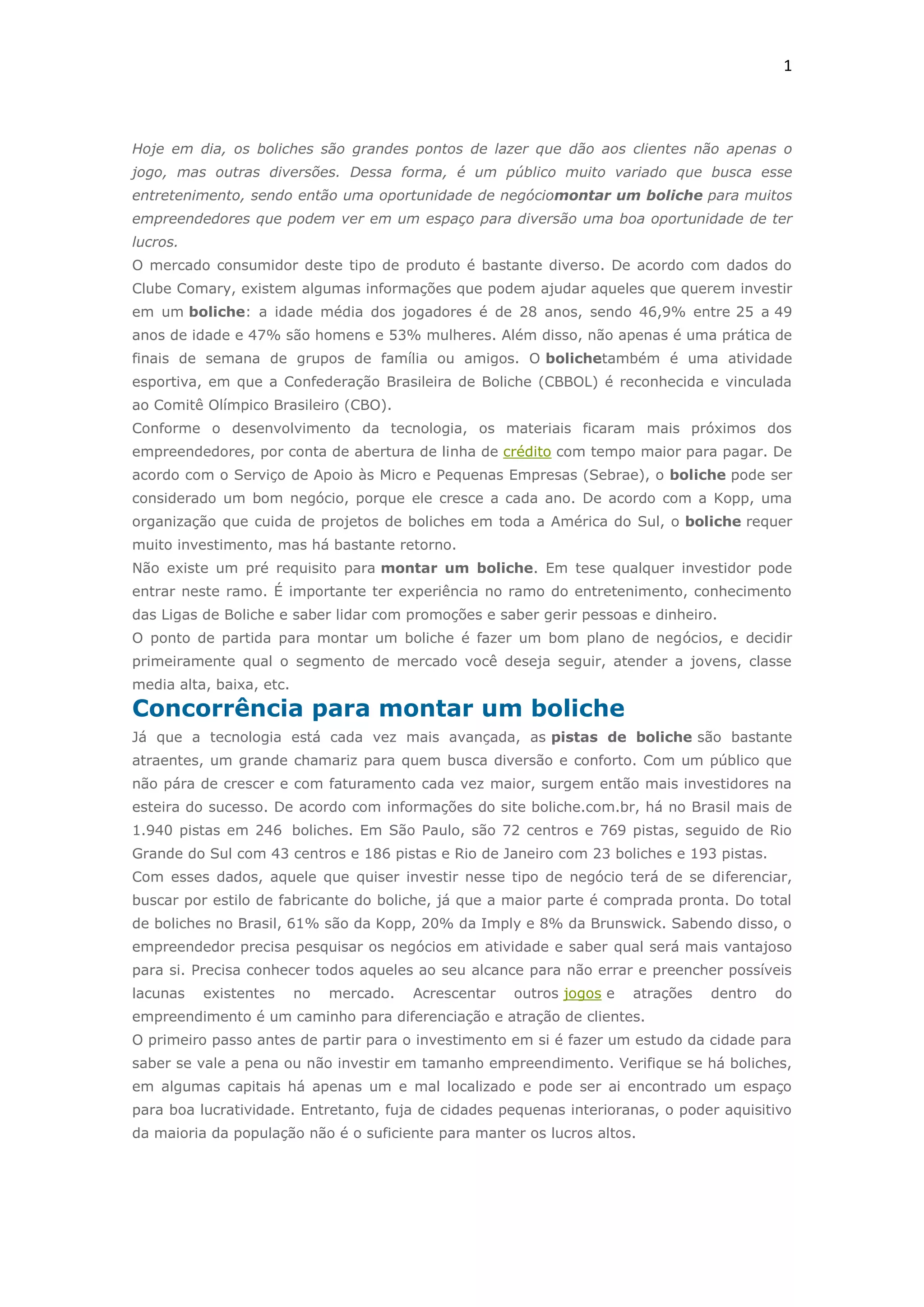 O documento fornece informações sobre a montagem e gestão de um boliche como negócio, destacando aspectos como: