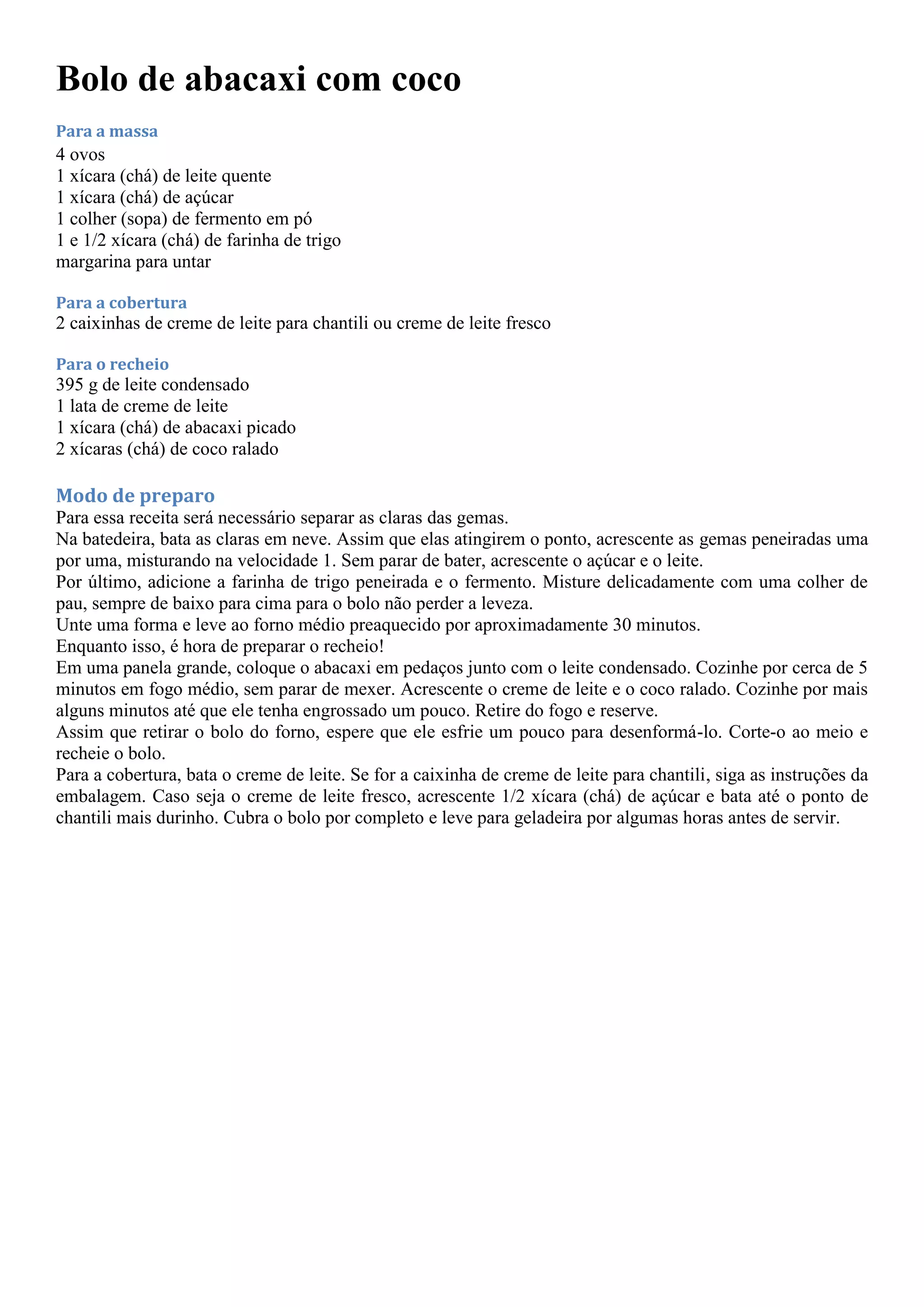 Este documento fornece a receita de um bolo de abacaxi com coco, que inclui uma massa de bolo feita com ovos, leite, açúcar e farinha, recheado com um creme feito de leite condensado, creme de leite, abacaxi e coco ralado, e coberto com chantili de creme de leite.
