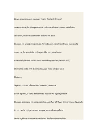 Este documento fornece a receita de uma torta de chocolate com recheio cremoso de chocolate e morangos. A torta consiste em duas camadas de pão de ló recheadas com creme de chocolate e morangos cobertos com chantilly, chocolate ralado e cacau em pó.