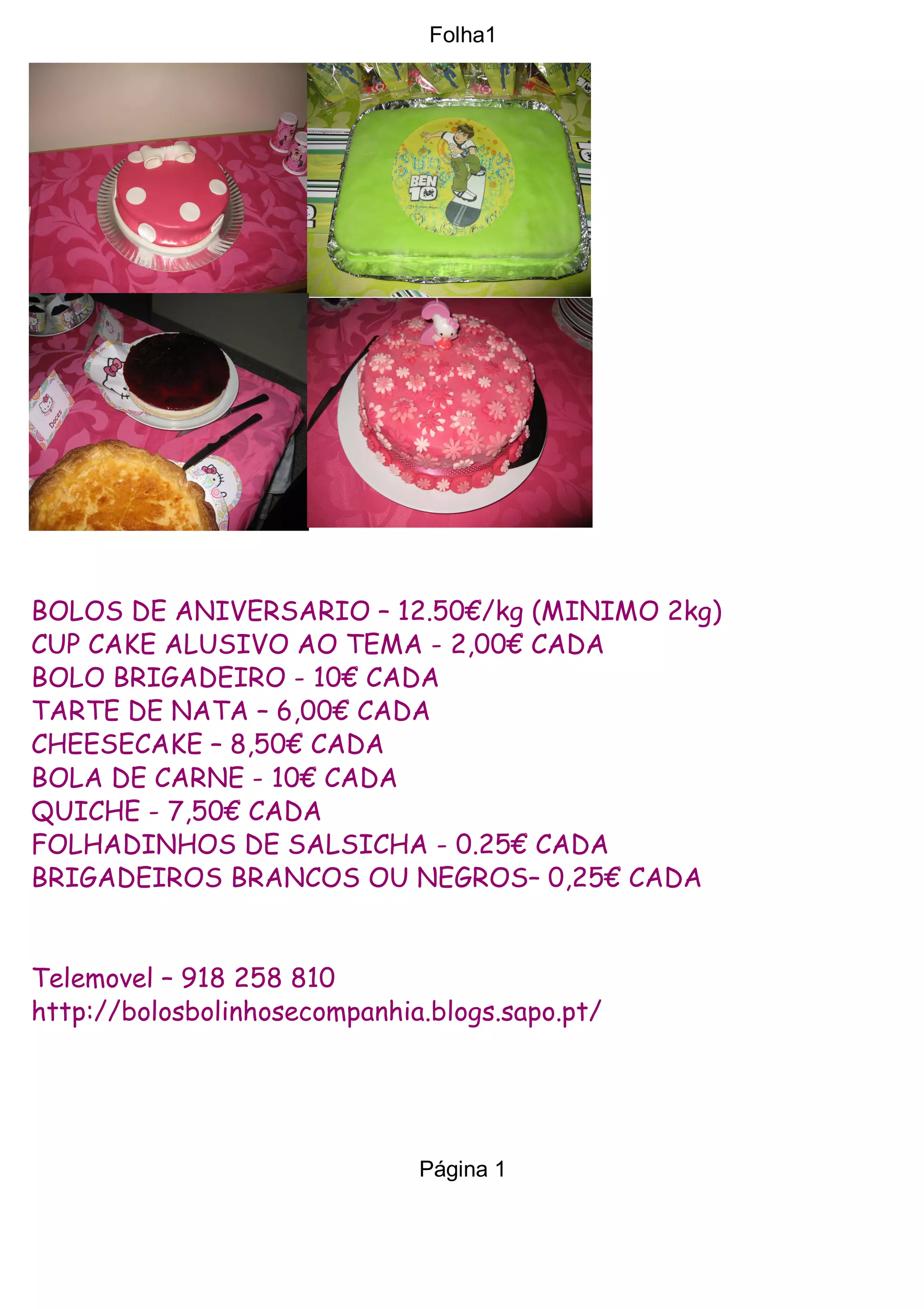 Este documento lista opções de bolos, doces e recheios para encomendas de aniversário, incluindo preços. Oferece bolos de aniversário a partir de 12,50€/kg, cupcakes temáticos por 2€ cada, bolo de brigadeiro por 10€ cada e outros itens como tarte de nata e quesecake. Também fornece contato telefônico e endereço online.