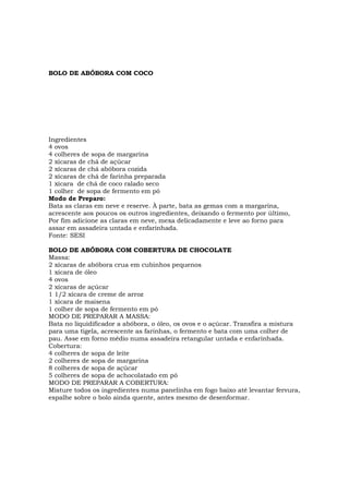 BOLO DE ABÓBORACOM COCO Ingredientes 4 ovos 4 colheres de sopa de margarina 2 xícaras de chá de açúcar 2 xícaras de chá abóbora cozida 2 xícaras de chá de farinha preparada 1 xícara de chá de coco ralado seco 1 colher de sopa de fermento em pó Modo de Preparo: Bata as claras em neve e reserve. À parte, bata as gemas com a margarina, acrescente aos poucos os outros ingredientes, deixando o fermento por último, Por fim adicione as claras em neve, mexa delicadamente e leve ao forno para assar em assadeira untada e enfarinhada. Fonte: SESI BOLO DE ABÓBORA COM COBERTURA DE CHOCOLATE Massa: 2 xícaras de abóbora crua em cubinhos pequenos 1 xícara de óleo 4 ovos 2 xícaras de açúcar 1 1/2 xícara de creme de arroz 1 xícara de maisena 1 colher de sopa de fermento em pó MODO DE PREPARAR A MASSA: Bata no liquidificador a abóbora, o óleo, os ovos e o açúcar. Transfira a mistura para uma tigela, acrescente as farinhas, o fermento e bata com uma colher de pau. Asse em forno médio numa assadeira retangular untada e enfarinhada. Cobertura: 4 colheres de sopa de leite 2 colheres de sopa de margarina 8 colheres de sopa de açúcar 5 colheres de sopa de achocolatado em pó MODO DE PREPARAR A COBERTURA: Misture todos os ingredientes numa panelinha em fogo baixo até levantar fervura, espalhe sobre o bolo ainda quente, antes mesmo de desenformar.