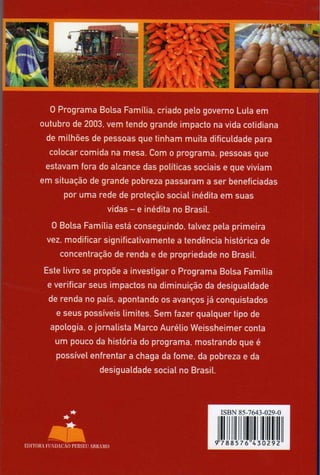 O documento discute o programa Bolsa Família no Brasil, incluindo seu histórico, impacto e debates em torno do programa. O Bolsa Família unificou vários programas de assistência social pré-existentes com o objetivo de ampliar a proteção social e corrigir distorções. Estudos apontam que o programa levou a reduções na desigualdade e pobreza, melhorias na segurança alimentar e frequência escolar, e teve impactos positivos na economia. No entanto, alguns apontam que é necessário ir além de programas assist
