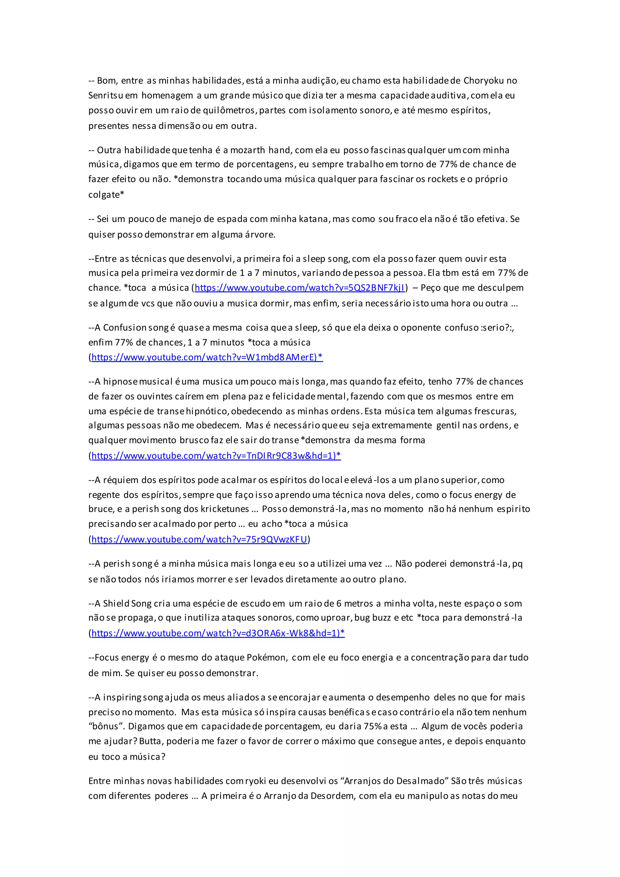 O documento descreve as habilidades musicais e espirituais de um indivíduo, incluindo a capacidade de ouvir a quilômetros de distância, hipnotizar pessoas com música, curar ou causar danos com diferentes melodias, e convocar espíritos. Muitas dessas habilidades tem uma chance de 77% de sucesso e podem deixar os ouvintes dormindo ou confusos por 1 a 7 minutos.