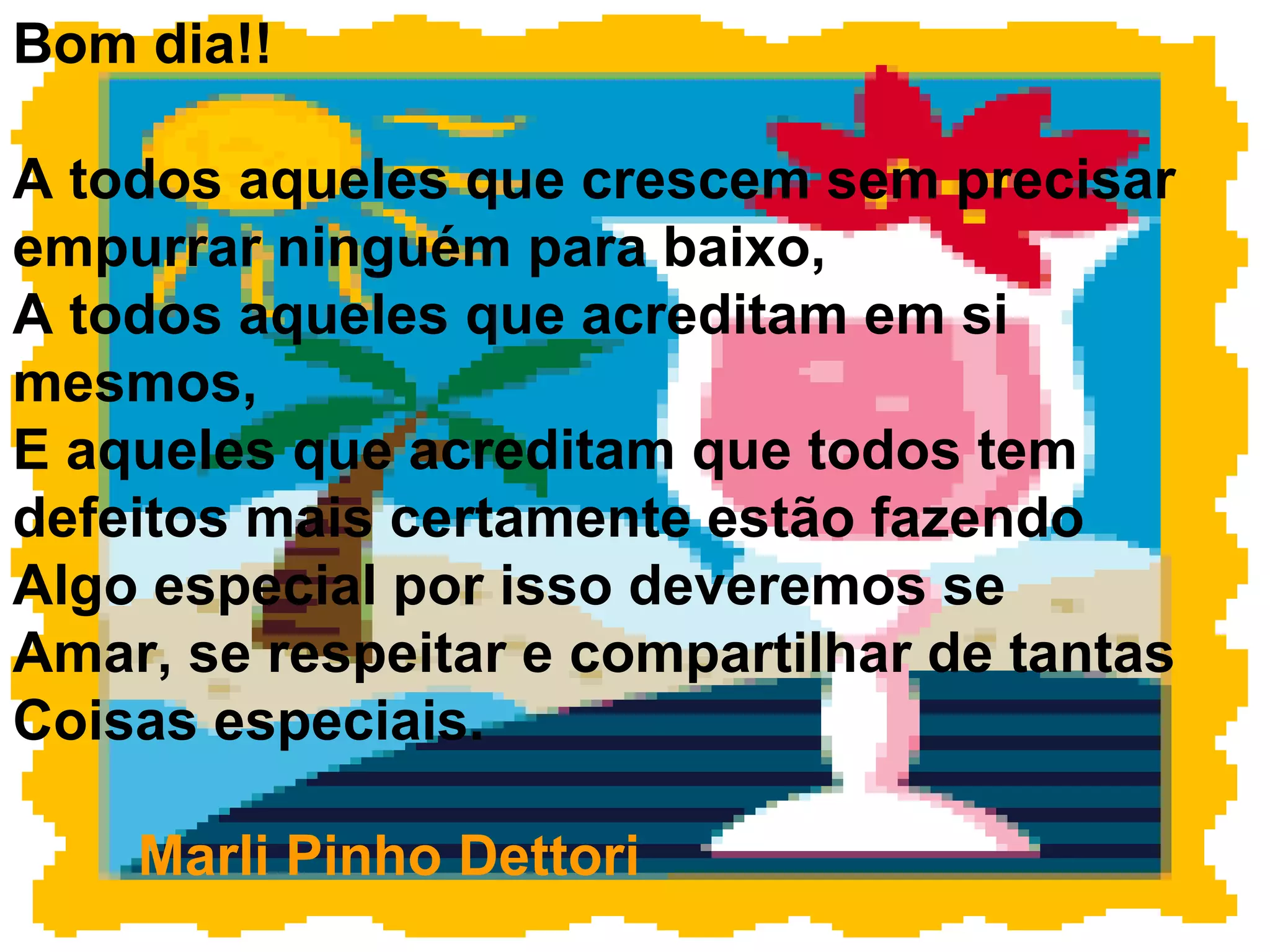 Este texto encoraja as pessoas a crescerem sem precisar derrubar os outros, acreditarem em si mesmas e compreenderem que todos têm defeitos, mas que também fazem coisas especiais, portanto devemos nos amar, respeitar uns aos outros e compartilhar momentos especiais.