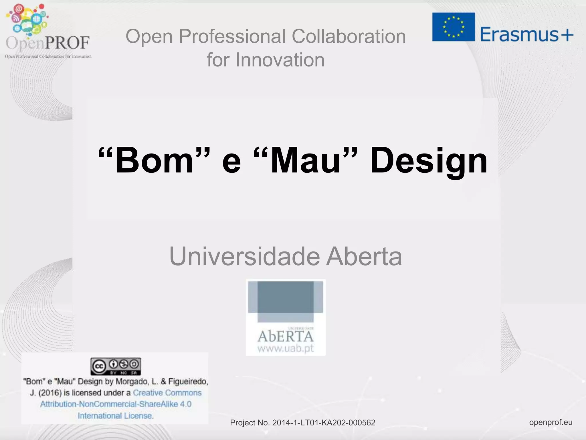 O documento discute o bom e mau design em apresentações. Ele fornece exemplos de slides com bom design que demonstram simplicidade, qualidade de imagem, cores adequadas e mensagens claras. Exemplos de slides com mau design são fornecidos mostrando sobrecarga de informação e legibilidade ruim. O documento conclui fornecendo links para slides de exemplo.