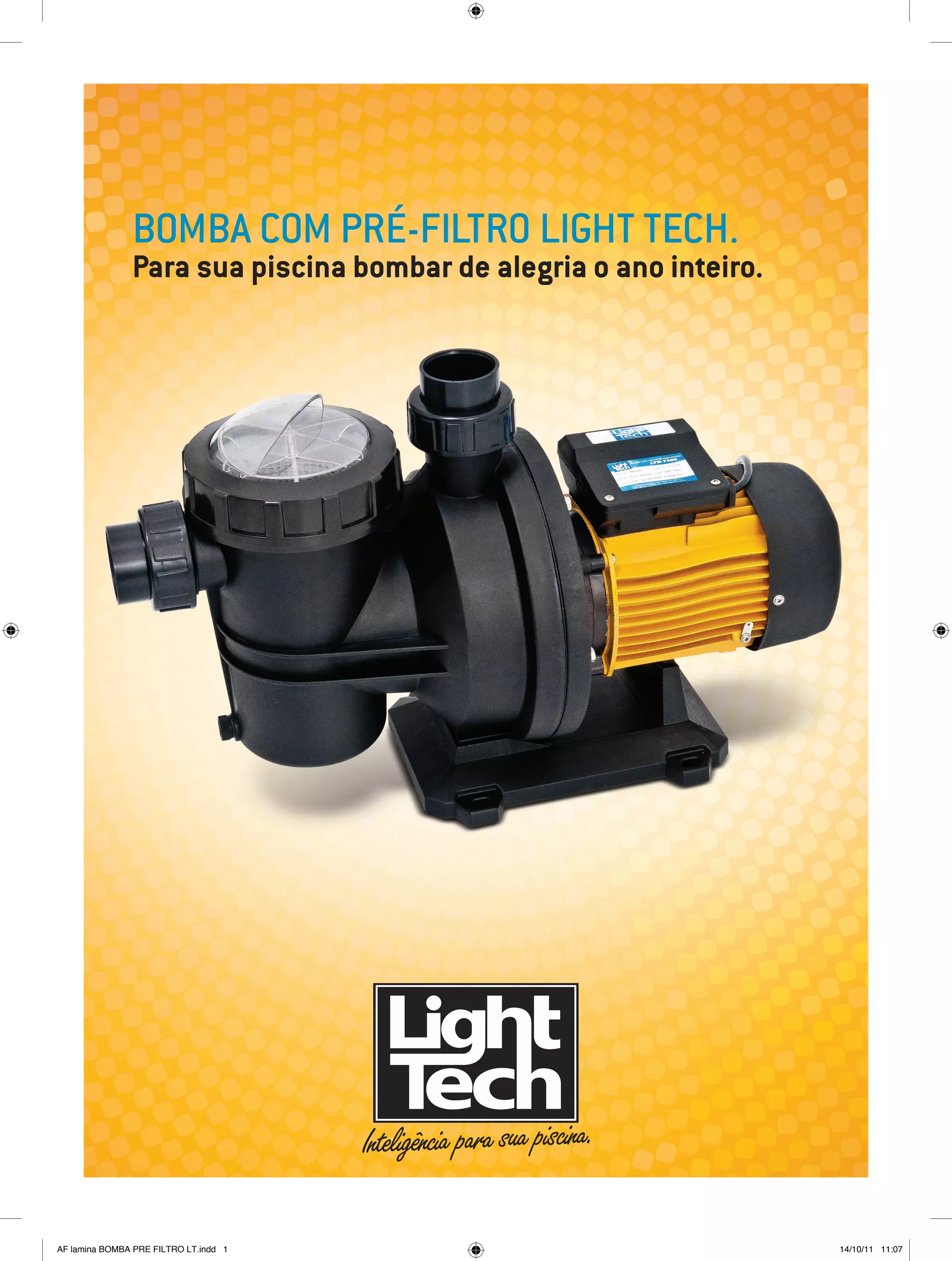 Este documento descreve bombas com pré-filtro da marca Light Tech para piscinas residenciais e comerciais. Ele fornece detalhes técnicos sobre os modelos, incluindo potência, vazão, dimensões e compatibilidade com filtros. A tabela indica o volume de água que cada modelo pode bombear em determinados períodos de tempo de acordo com o tamanho da piscina.