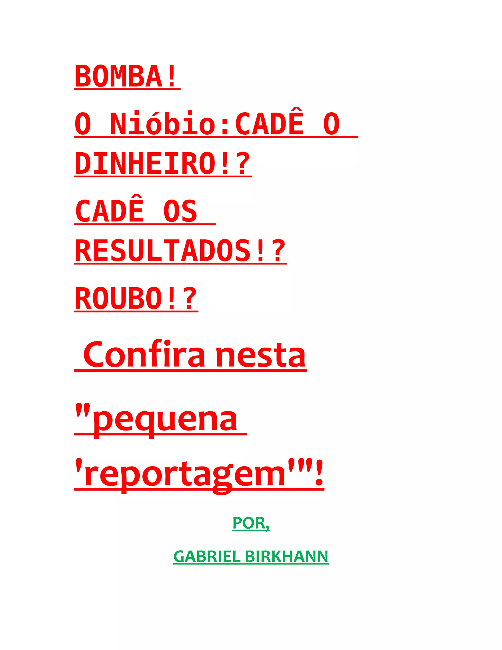 O documento discute como o Brasil está perdendo bilhões em receita anual devido à subfaturação das exportações de nióbio. O nióbio é negociado por preços muito mais altos internacionalmente do que o preço pelo qual o Brasil o vende, e o país deixa de arrecadar impostos sobre as exportações que poderiam valer até US$ 100 bilhões por ano. Artigos de jornais e blogs são citados criticando como o Brasil está sendo lesado nesse comércio de nióbio.