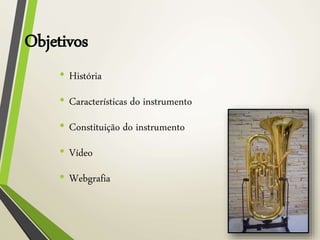 O documento discute a história e características do bombardino. Começa descrevendo como a serpente era um instrumento antigo e desafinado, e como o sistema de pistão permitiu melhorias nos instrumentos de sopro em 1818. Explica que o bombardino foi inventado por Ferdinand Sommer em 1843 e modificado por David Blaikley em 1874 para a forma atual. Resume as características do bombardino, incluindo que é feito de bronze, tem 4-6 válvulas, e alcance de 4 oitavas.