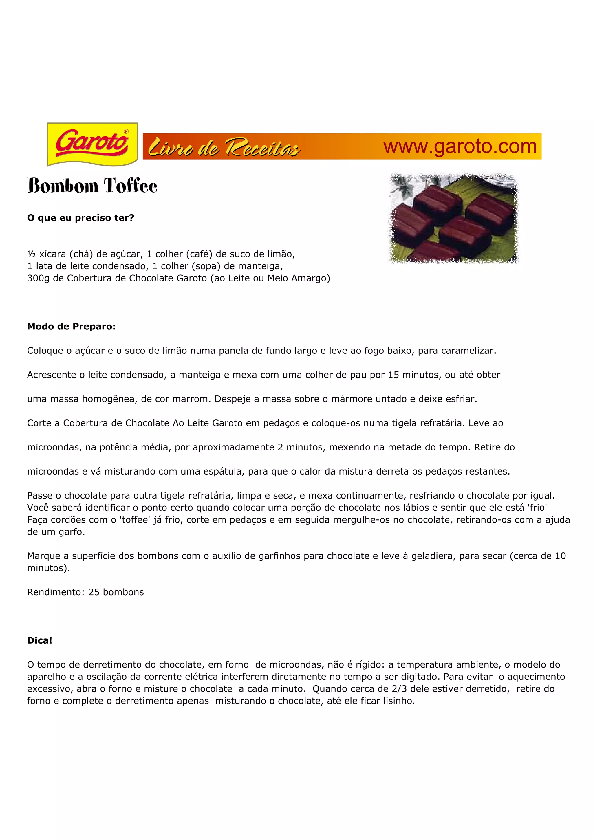 Este documento fornece uma receita para bombons de toffee e chocolate Garoto. A receita inclui ingredientes como açúcar, suco de limão, leite condensado e manteiga para o toffee, e cobertura de chocolate Garoto para revestir os toffees. As instruções explicam como caramelizar o toffee e derreter o chocolate para revestir os toffees antes de colocá-los na geladeira para endurecer.