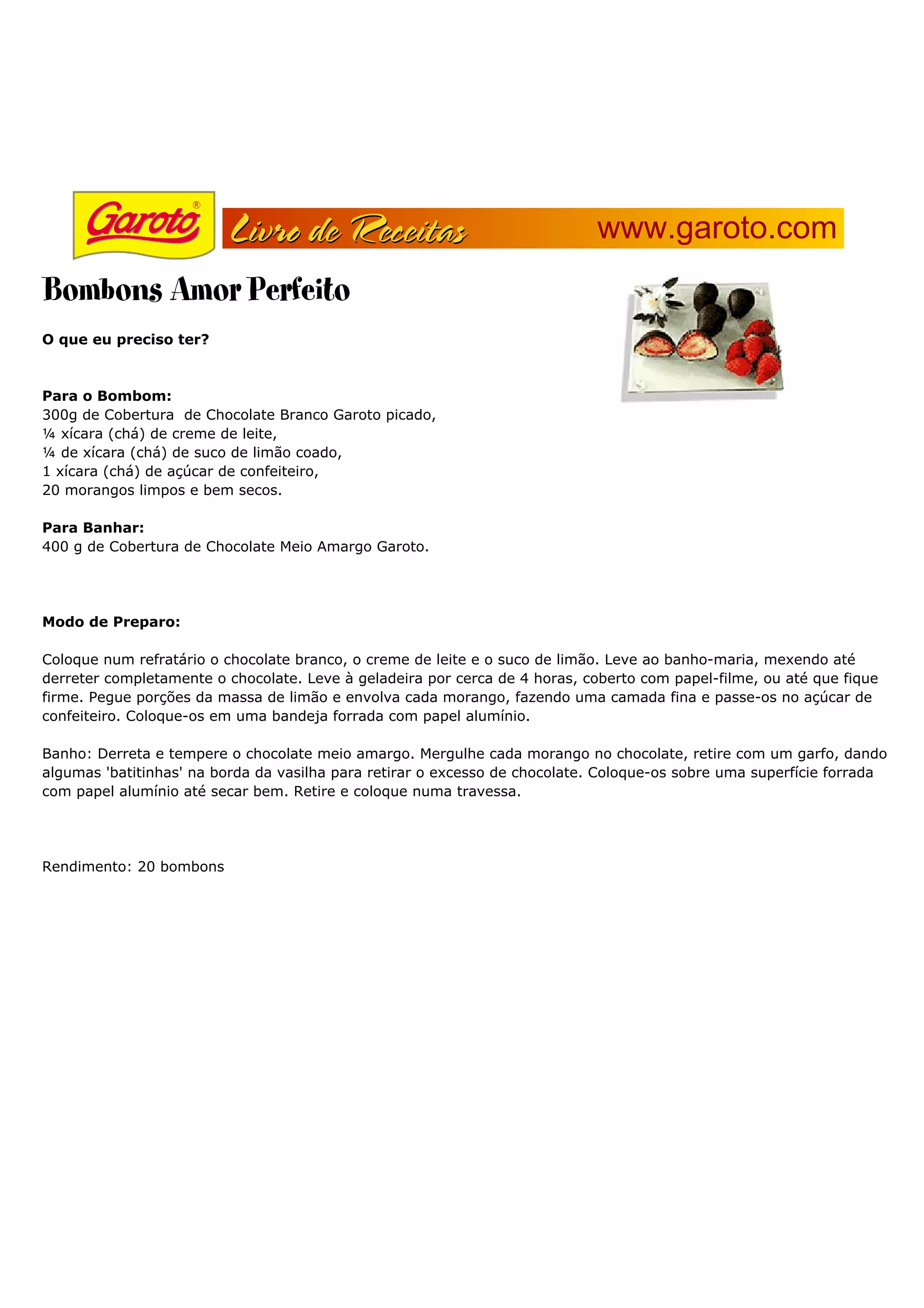 Este documento fornece uma receita para bombons de morango cobertos com chocolate. A receita inclui instruções para preparar uma cobertura de chocolate branco com creme de leite e suco de limão para envolver os morangos, bem como uma cobertura de chocolate meio-amargo para banhar os bombons finalizados.