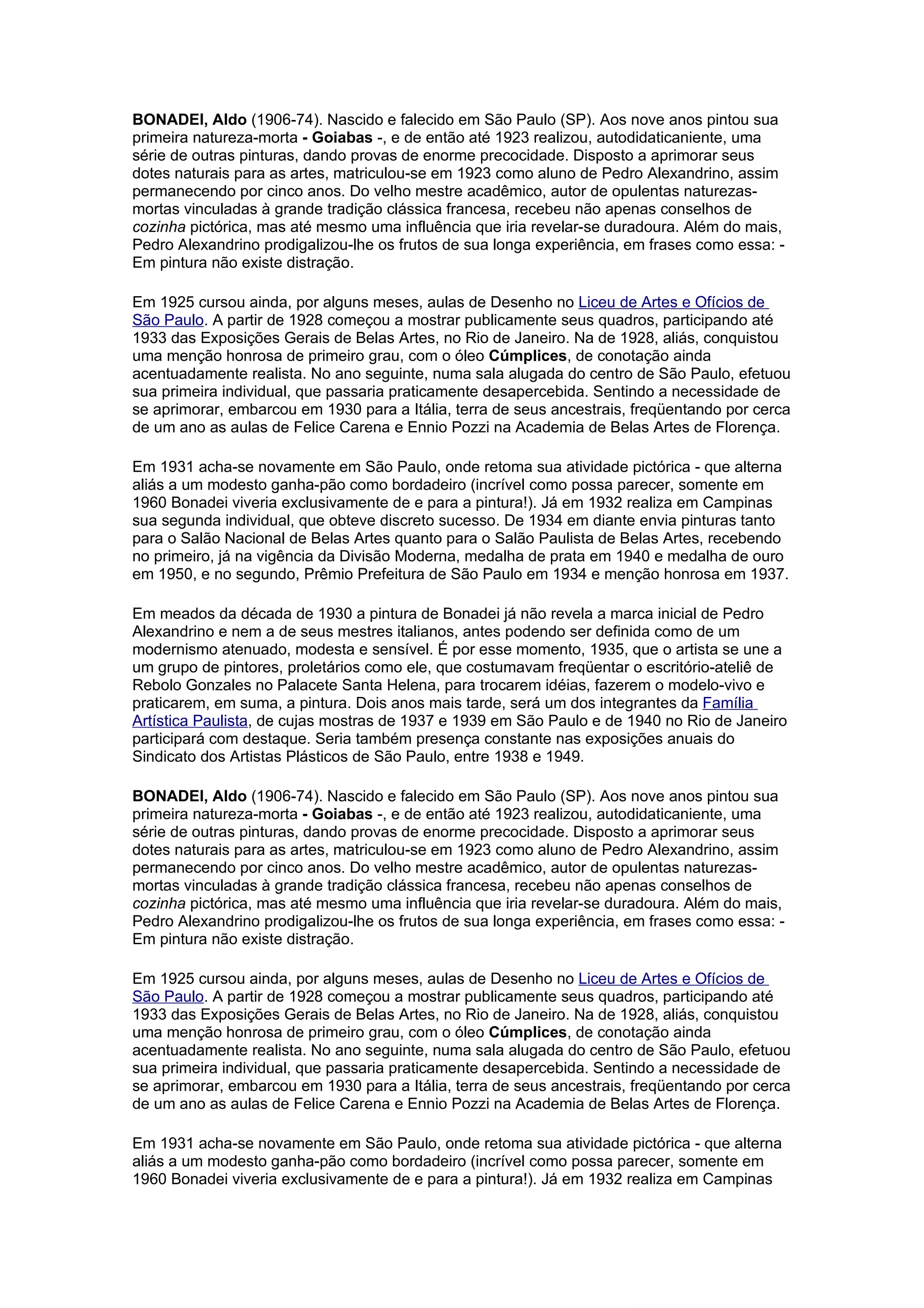 Aldo Bonadei foi um pintor brasileiro nascido em 1906 em São Paulo. Ele começou a pintar desde criança de forma autodidata e estudou com o mestre Pedro Alexandrino entre 1923-1928. Bonadei aprimorou sua técnica na Itália entre 1930-1931 e seu estilo evoluiu para um modernismo sensível. Ele participou de diversas exposições individuais e coletivas no Brasil entre as décadas de 1930 e 1940.