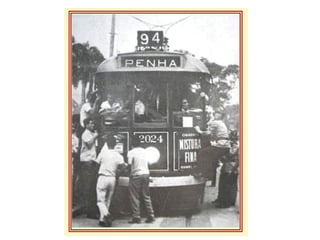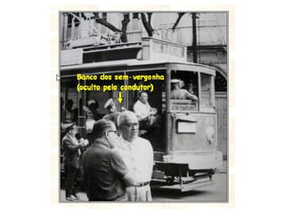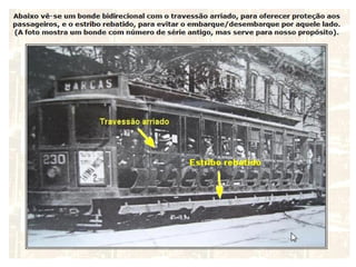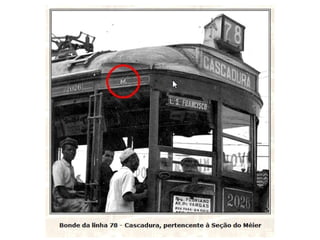O documento descreve cenas do Rio de Janeiro nas décadas de 40, 50 e 60 através de fotos de bondes e outros aspectos da época. Inclui imagens de bondes circulando em ruas movimentadas, no Cemitério dos Bondes após sua desativação, e de outros meios de transporte e serviços como ambulâncias e entregas de café. O compilador expressa nostalgia por quem viveu aquele período que fazia parte do cotidiano.