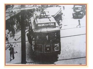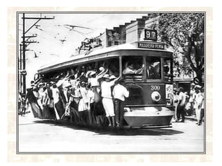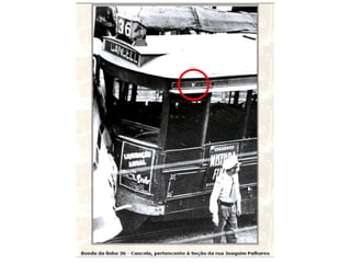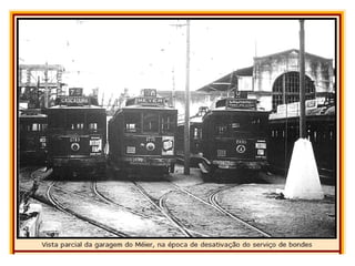 O documento resume imagens históricas dos bondes no Rio de Janeiro nas décadas de 40, 50 e 60 através de fotos. Mostra cenas como o cemitério de bondes desmontados, engarrafamentos na Rua Haddock Lobo, bondes circulando na Praça Floriano e no bairro de Campo Grande, e o famoso bonde "Bataclã" entrando no túnel para Copacabana. Também apresenta outras cenas da época como carros de entrega e ambulâncias.