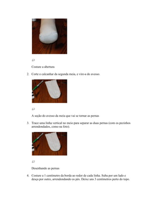 Este documento fornece instruções passo-a-passo para fazer uma boneca de meia, começando com o enchimento de uma meia para formar o corpo e cabeça e depois costurando pedaços de outra meia para formar as pernas e braços, e adicionando detalhes como rosto e cabelo.