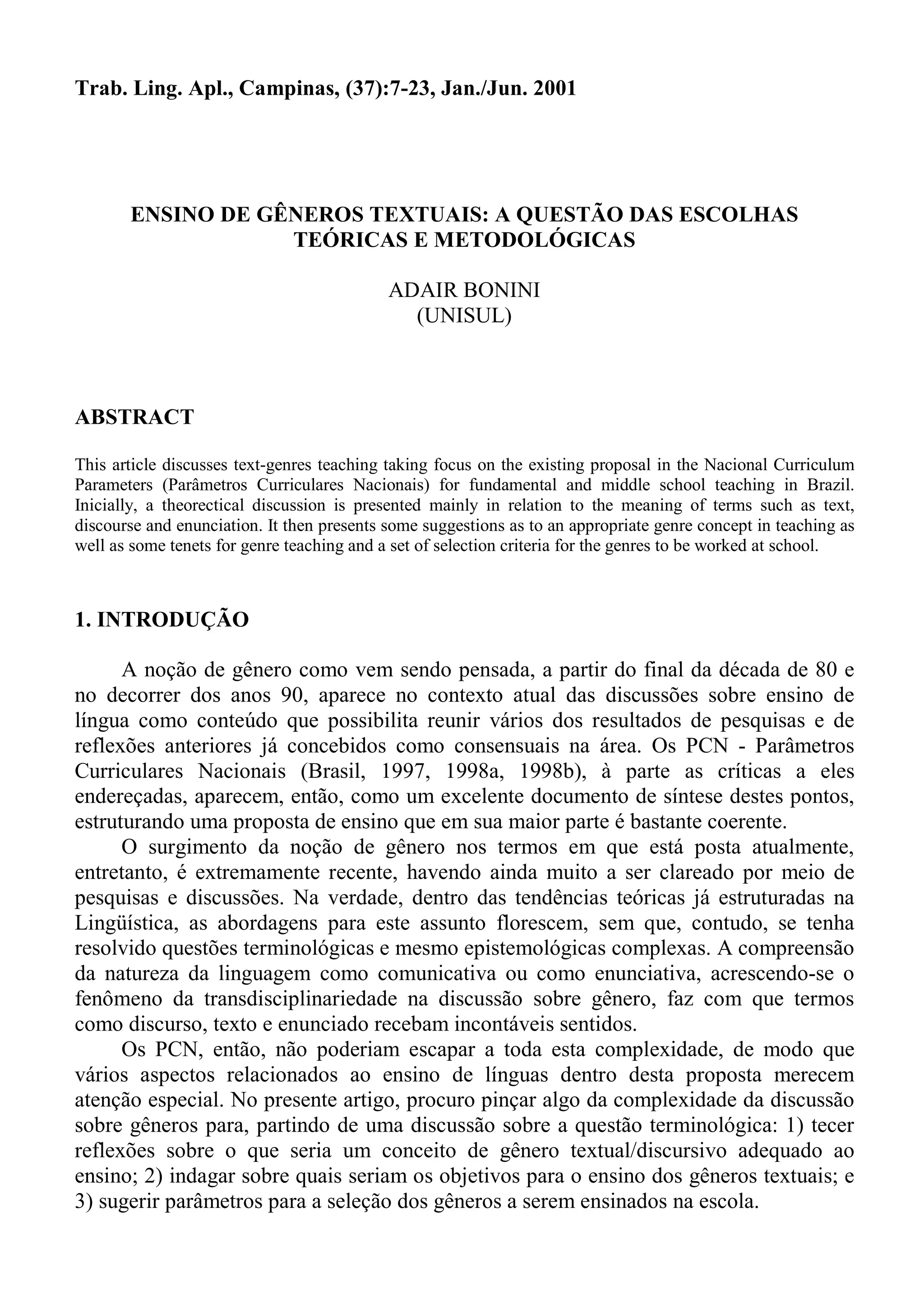 1) O documento discute a proposta do ensino de gêneros textuais nos Parâmetros Curriculares Nacionais brasileiros, focando nas escolhas teóricas e metodológicas.