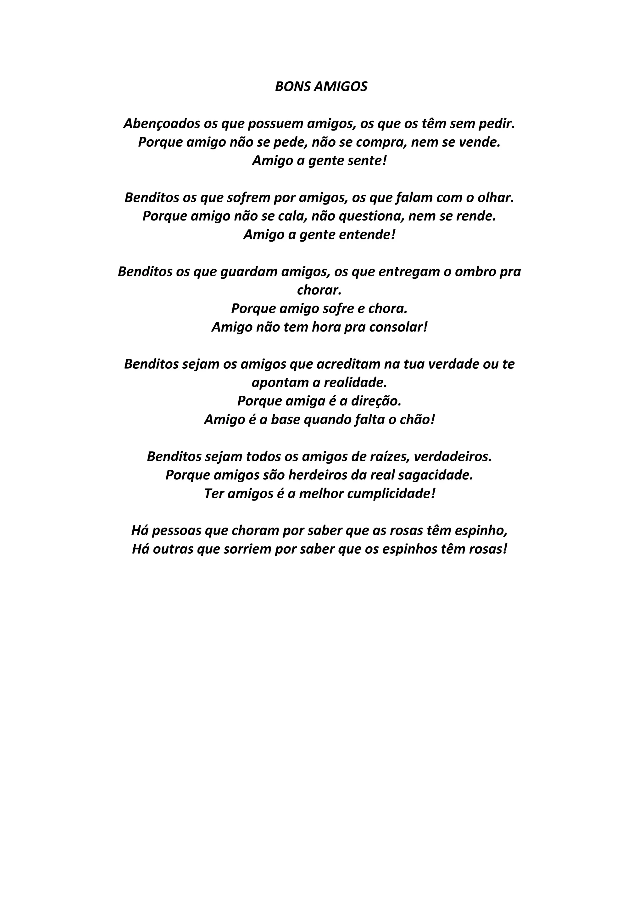 O documento descreve a importância e o valor da amizade. Em três frases, destaca que amigos verdadeiros não são escolhidos, mas sim sentidos; que amigos compartilham lembranças difíceis e experiências ao invés de apenas bens materiais; e que amigos oferecem apoio emocional nos momentos difíceis da vida.