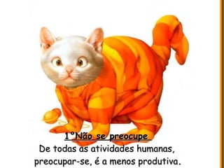 O documento fornece 6 dicas para lidar com problemas de forma produtiva: 1) Não se preocupe, pois é pouco produtivo; 2) Enfrente os problemas um de cada vez; 3) Não leve os problemas para a cama, pois atrapalham o sono.