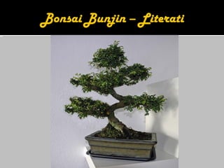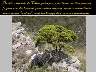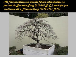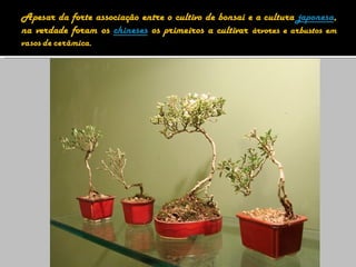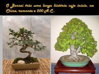 1) O bonsai teve origem na China no século III a.C. e chegou ao Japão durante a Era Kamimura, onde os primeiros registros datam dessa época.