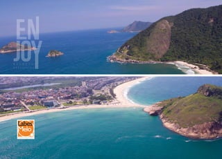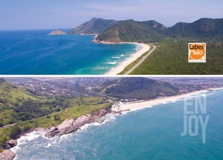 O documento descreve um empreendimento imobiliário chamado Enjoy Recreio Residences, localizado na região do Recreio dos Bandeirantes no Rio de Janeiro. O empreendimento oferece três tipos de unidades (Top House, Up House e Garden House) com diferentes opções de lazer, como piscinas, academia, spa e parque aquático.