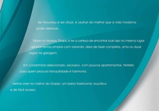 O documento descreve o empreendimento residencial Nouveau Grajaú, localizado no bairro do Grajaú no Rio de Janeiro. O projeto oferece apartamentos de 2 e 3 quartos com área de lazer completa, incluindo piscina, academia e salão de festas. O empreendimento promete qualidade de vida em família em um condomínio fechado e seguro, próximo a diversos serviços e atrações da cidade.