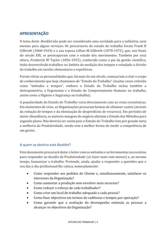 O documento discute o estudo do trabalho, que se concentra em métodos e medições de tempo para melhorar a produtividade e humanização no ambiente de trabalho. Ele revisita a história do estudo do trabalho e a sua importância em períodos de crise econômica, além de abordar questões práticas enfrentadas nos ambientes profissionais. O objetivo é fornecer ferramentas e métodos para aumentar a produtividade e a satisfação dos trabalhadores.