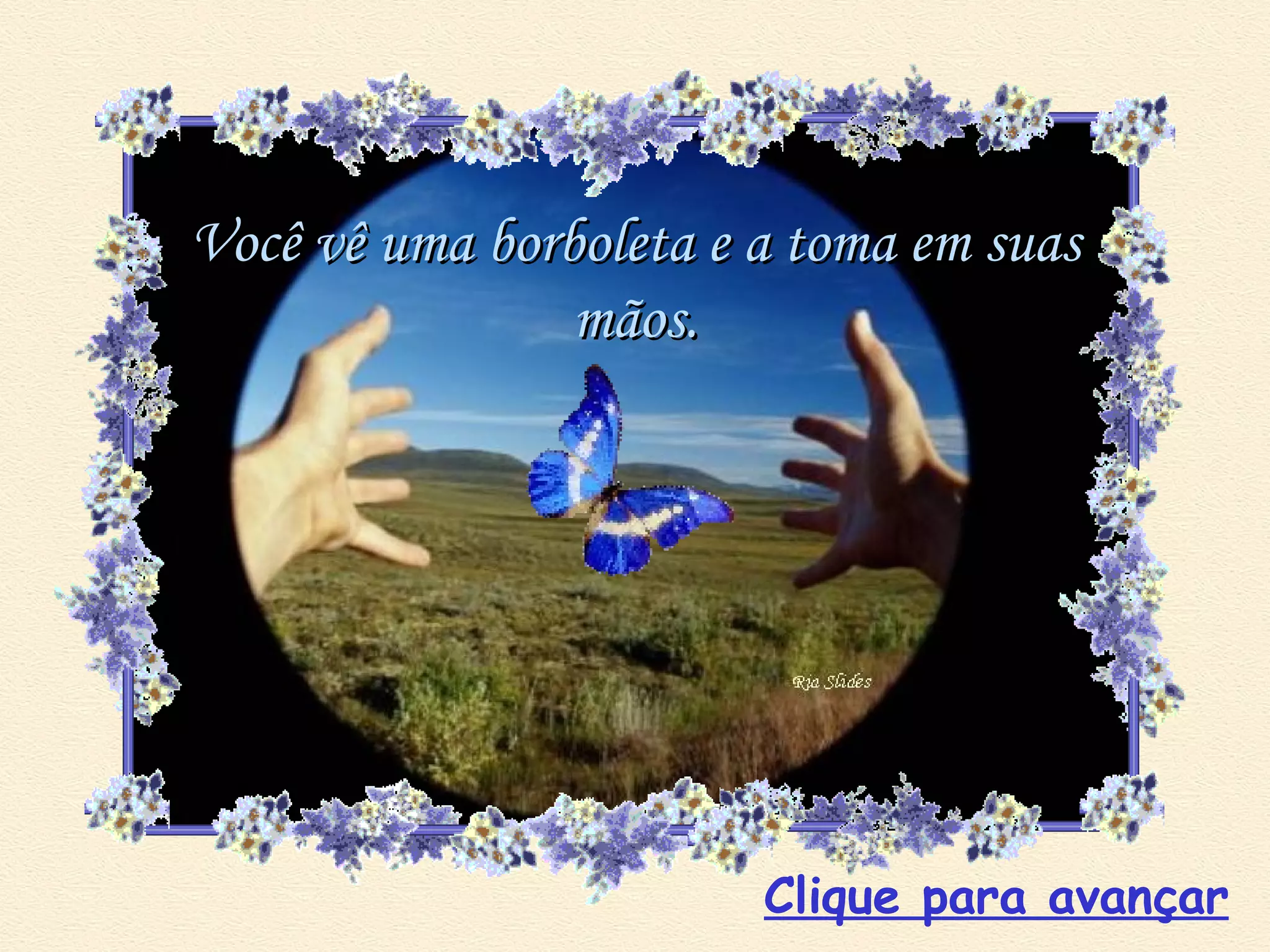 A história fala sobre alguém que vê uma borboleta e a captura em suas mãos, achando que poderia mantê-la para sempre, mas acaba percebendo que a beleza dela estava em sua liberdade e a solta, aprendendo que se ama algo deve deixá-lo livre.
