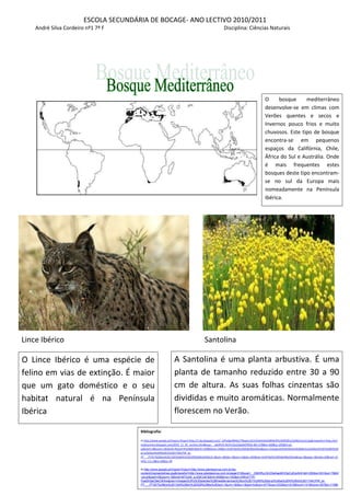 <br />O bosque mediterrâneo desenvolve-se em climas com Verões quentes e secos e Invernos pouco frios e muito chuvosos. Este tipo de bosque encontra-se em pequenos espaços da Califórnia, Chile, África do Sul e Austrália. Onde é mais frequentes estes bosques deste tipo encontram-se no sul da Europa mais nomeadamente na Península Ibérica.<br />5118735429260 <br />-512445121920<br /> <br />Bibliografia:In:http://www.google.pt/imgres?imgurl=http://1.bp.blogspot.com/_JOFaQpt9M6U/TNxplccnG1I/AAAAAAAABN4/XH1tlOMZfrU/s640/Lince2.jpg&imgrefurl=http://animalesenvivo.blogspot.com/2010_11_01_archive.html&usg=__wk4HV5-ReIVxYZuUlJgdA0TBt0s=&h=378&w=560&sz=205&hl=pt-pt&start=0&zoom=1&tbnid=9rq2oFI4r628jM:&tbnh=109&tbnw=144&ei=ImlATdyEKs2WhQe96oC0Aw&prev=/images%3Fq%3Dlices%2Bibericos%26um%3D1%26hl%3Dpt-pt%26sa%3DN%26rlz%3D1T4ACPW_pt-PT___PT357%26biw%3D1345%26bih%3D529%26tbs%3Disch:1&um=1&itbs=1&iact=rc&dur=202&oei=ImlATdyEKs2WhQe96oC0Aw&esq=1&page=1&ndsp=24&ved=1t:429,r:11,s:0&tx=26&ty=78 In:http://www.google.pt/imgres?imgurl=http://www.plantasonya.com.br/wp-content/img/santolinas.jpg&imgrefurl=http://www.plantasonya.com.br/page/216&usg=__OMHRyUSrOSeAap9XX3gCyEzs544=&h=250&w=631&sz=79&hl=pt-pt&start=0&zoom=1&tbnid=MTdJdh_qJG9CxM:&tbnh=65&tbnw=163&ei=NWxATYP-FoeDhQeC9eCWAw&prev=/images%3Fq%3Dplantas%2Bmediterranicas%26um%3D1%26hl%3Dpt-pt%26sa%3DN%26rlz%3D1T4ACPW_pt-PT___PT357%26biw%3D1345%26bih%3D529%26tbs%3Disch:1&um=1&itbs=1&iact=hc&vpx=577&vpy=232&dur=515&hovh=141&hovw=357&tx=118&ty=130&oei=NWxATYP-FoeDhQeC9eCWAw&esq=1&page=1&ndsp=22&ved=1t:429,r:11,s:0SantolinaO Lince Ibérico é uma espécie de felino em vias de extinção. É maior que um gato doméstico e o seu habitat natural é na Península IbéricaLince IbéricoA Santolina é uma planta arbustiva. É uma planta de tamanho reduzido entre 30 a 90 cm de altura. As suas folhas cinzentas são divididas e muito aromáticas. Normalmente florescem no Verão. <br />