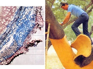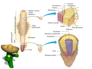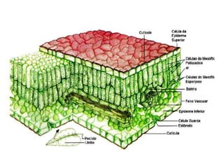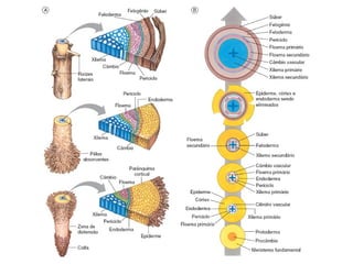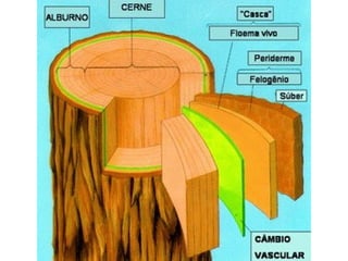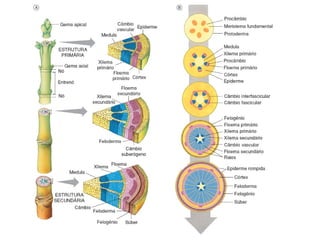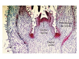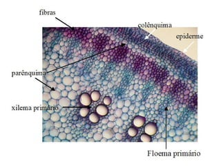 O documento descreve as principais estruturas e tecidos vegetais, incluindo meristemas, epiderme, xilema, floema, parênquima, esclerênquima e colênquima. Ele detalha as características, funções e localizações típicas de cada um desses tecidos no corpo de uma planta.