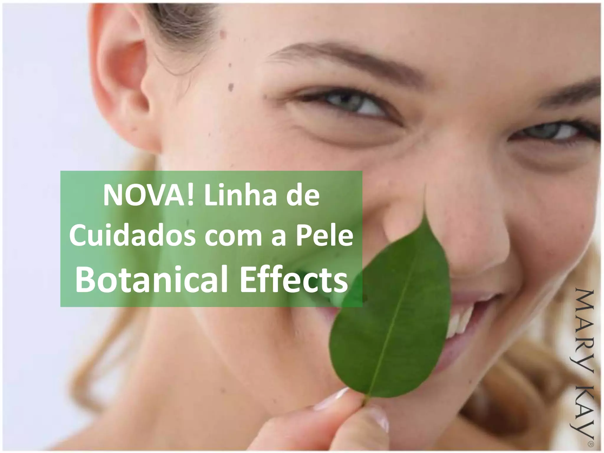Este documento apresenta a nova linha de cuidados com a pele Botanical Effects da Mary Kay. A linha foi formulada com ingredientes botânicos naturais para atender diferentes tipos de pele e oferece benefícios personalizados. A embalagem da linha possui menor impacto ambiental ao utilizar material reciclado e ser reciclável. Estudos demonstraram que a linha deixa a pele mais hidratada e com aparência saudável.
