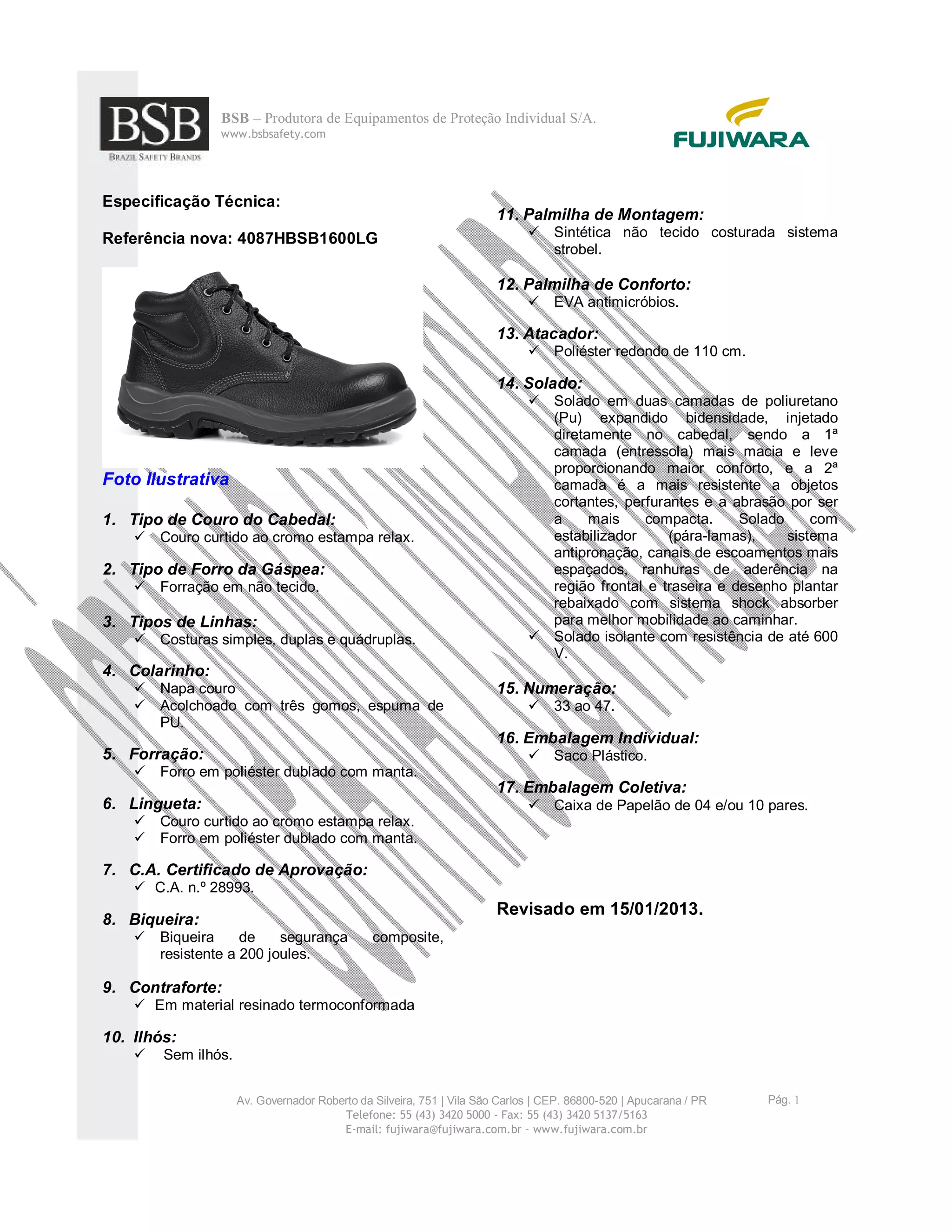 Este documento fornece especificações técnicas detalhadas de dois modelos de botas de segurança fabricadas pela BSB - Produtora de Equipamentos de Proteção Individual S/A, descrevendo os materiais, características e especificações de cada parte.