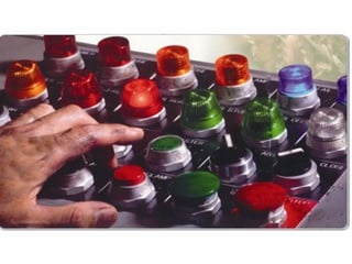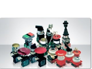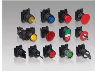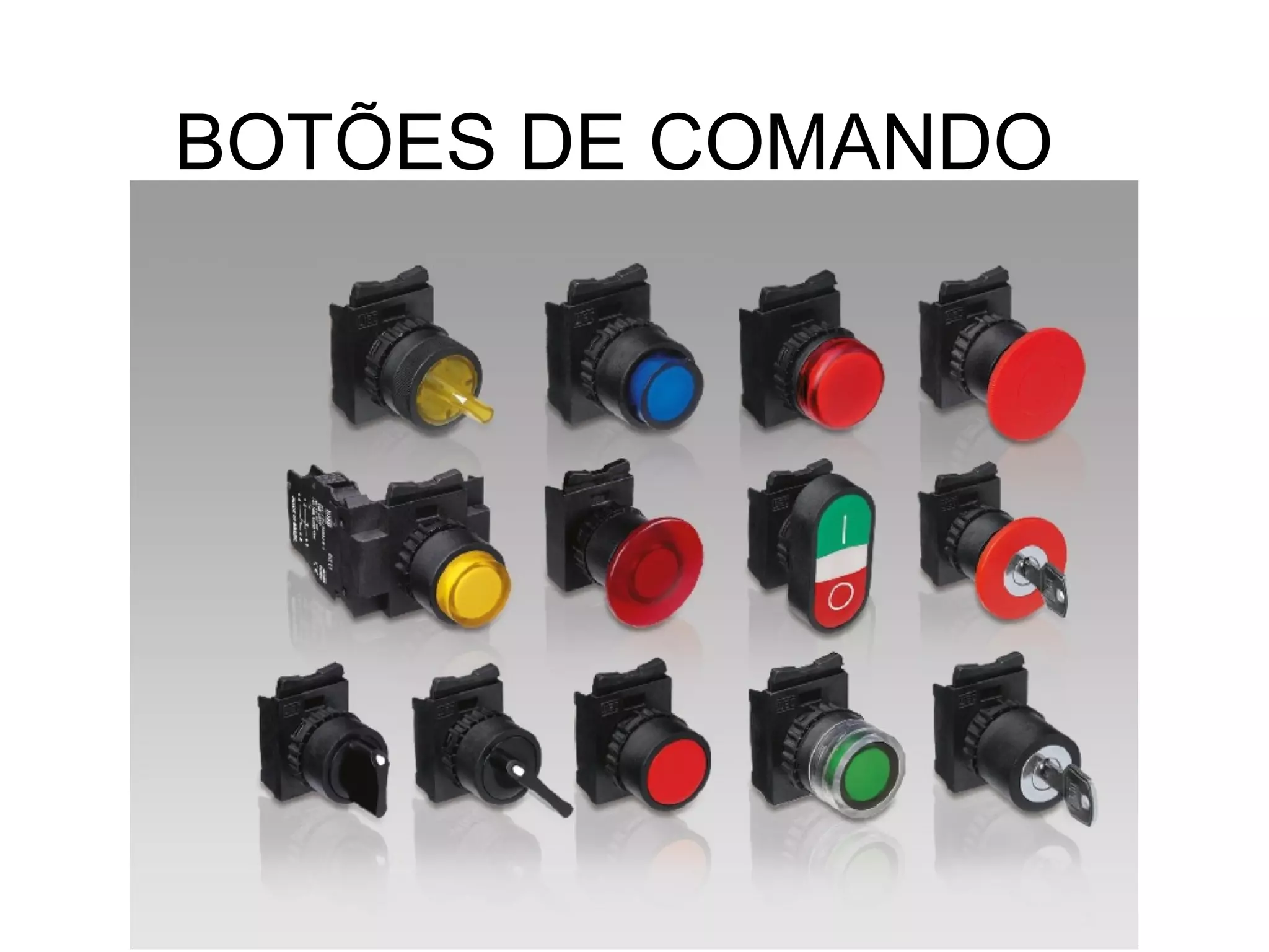 O documento descreve diferentes tipos de botões de comando, incluindo suas características e usos. Detalha botões de impulsão, comutação, emergência e seus símbolos. Também apresenta elementos de saída de sinais como indicadores luminosos e sonoros.