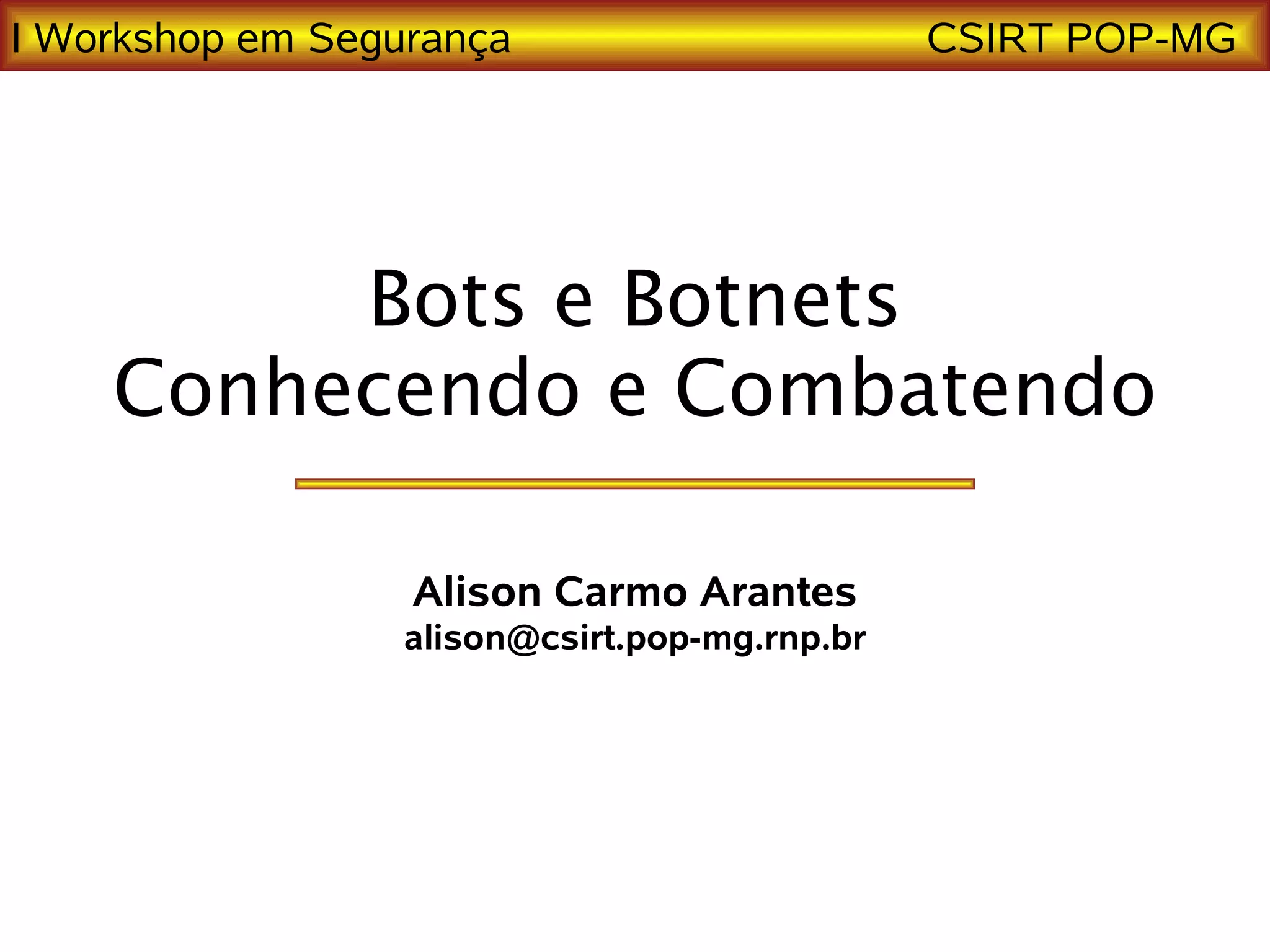 O documento apresenta uma introdução sobre bots e botnets, explicando o que são, como funcionam e os riscos que podem causar, como DDoS, spam e roubo de dados. Também fornece dicas para detecção e combate, como análise de tráfego de rede, uso de IDS e honeypots.