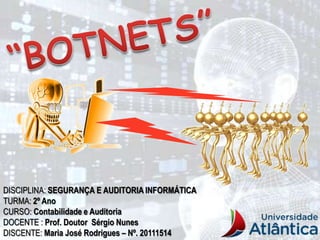 O documento discute o que são "bots" e "botnets", como são criados e usados para ataques de negação de serviço distribuídos e envio de spam. Ele também aborda as vulnerabilidades exploradas por bots, os riscos envolvidos para usuários e organizações, e formas básicas de defesa, como manter antivírus atualizado e não clicar em links desconhecidos.