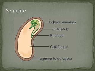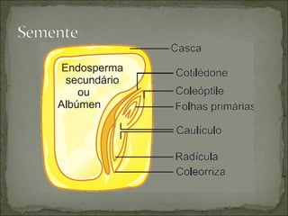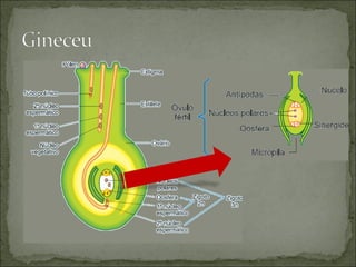 O documento descreve os principais tipos de reprodução em plantas, estruturas reprodutivas e dispersão de sementes, incluindo dicogamia, dioicia, hercogamia, heterostilia e autoesterilidade. Também explica as partes da flor, fruto, semente e disseminação.