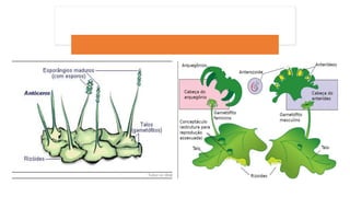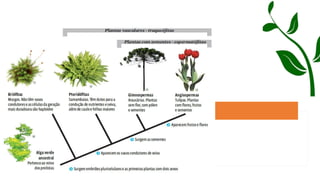 O documento descreve as principais características das briófitas, pteridófitas, gimnospermas e angiospermas, incluindo sua reprodução e evolução. As briófitas são avasculares, enquanto pteridófitas, gimnospermas e angiospermas possuem tecidos condutores. As angiospermas se diferenciam por terem flores e frutos protegendo suas sementes.