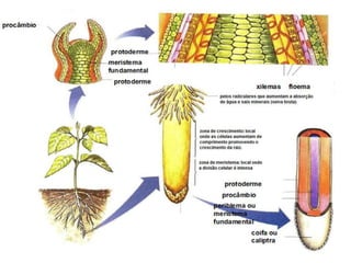O documento apresenta informações sobre diferentes aspectos da botânica, incluindo briófitas, pteridófitas, gimnospermas, angiospermas, órgãos vegetativos como raiz, caule e folha, órgãos reprodutivos como flor e fruto, além de conceitos de histologia vegetal e organologia vegetal.