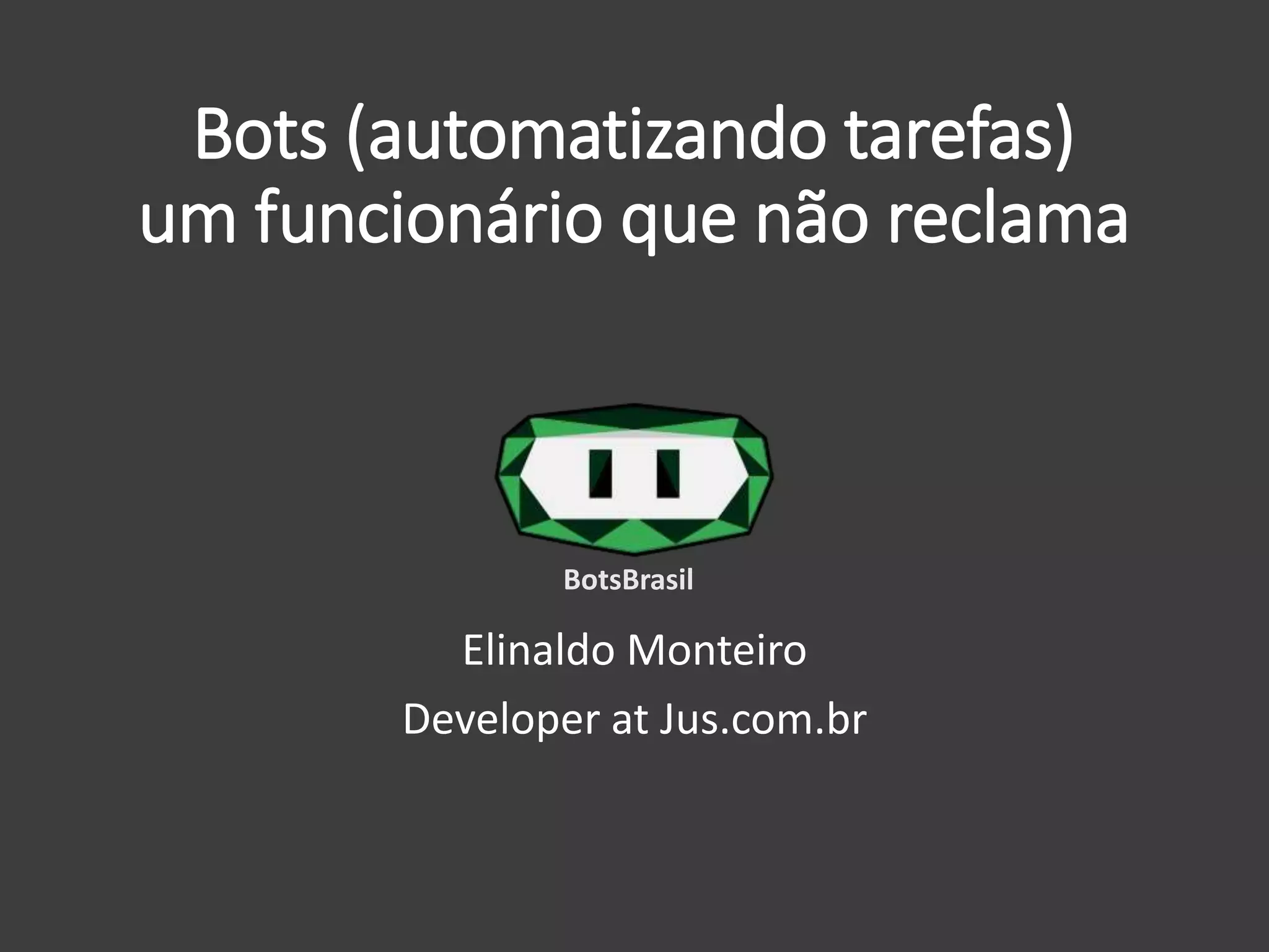 O documento discute o conceito de bots, definindo-os como assistentes virtuais que automatizam tarefas para ajudar nas atividades diárias de forma eficiente. Também aborda os benefícios dos bots, como desempenho, eficiência e disponibilidade, e exemplos de bots como o GoogleBot.